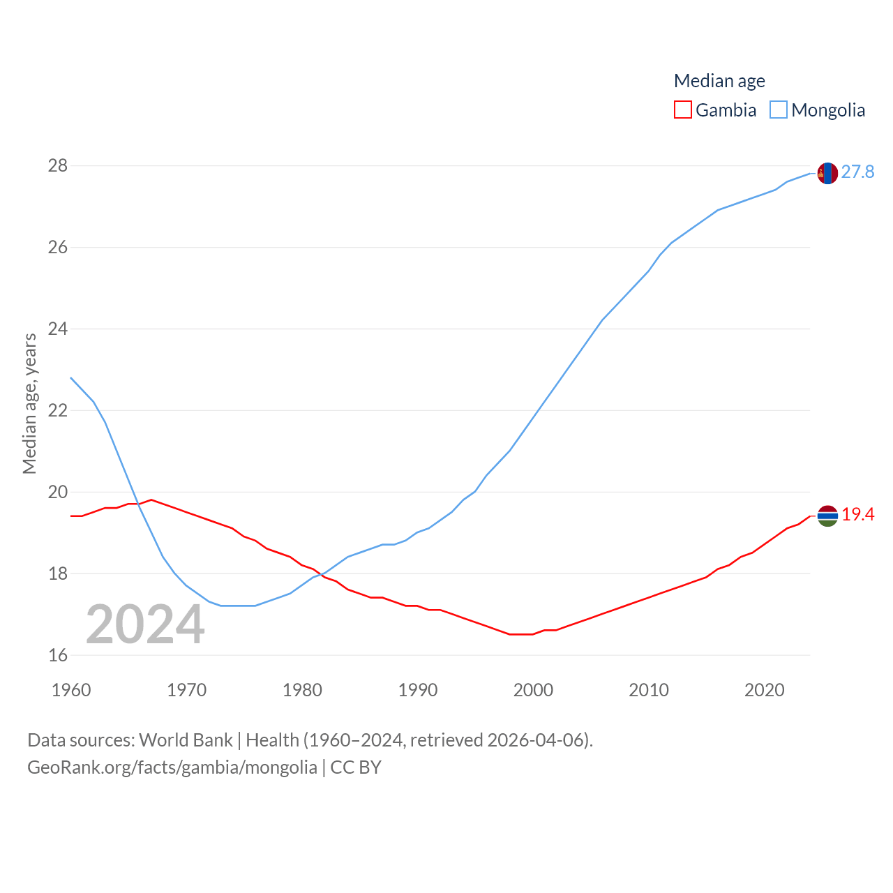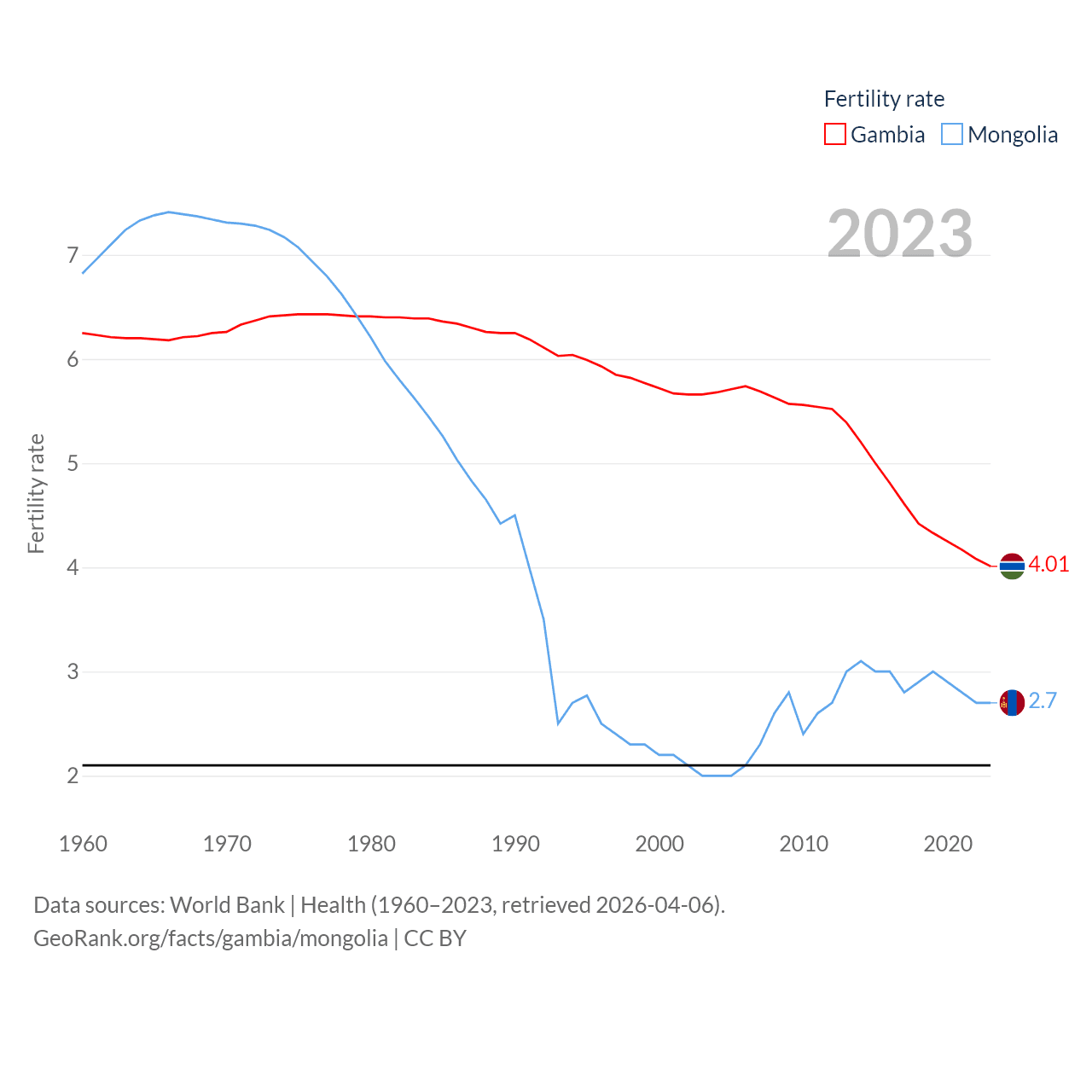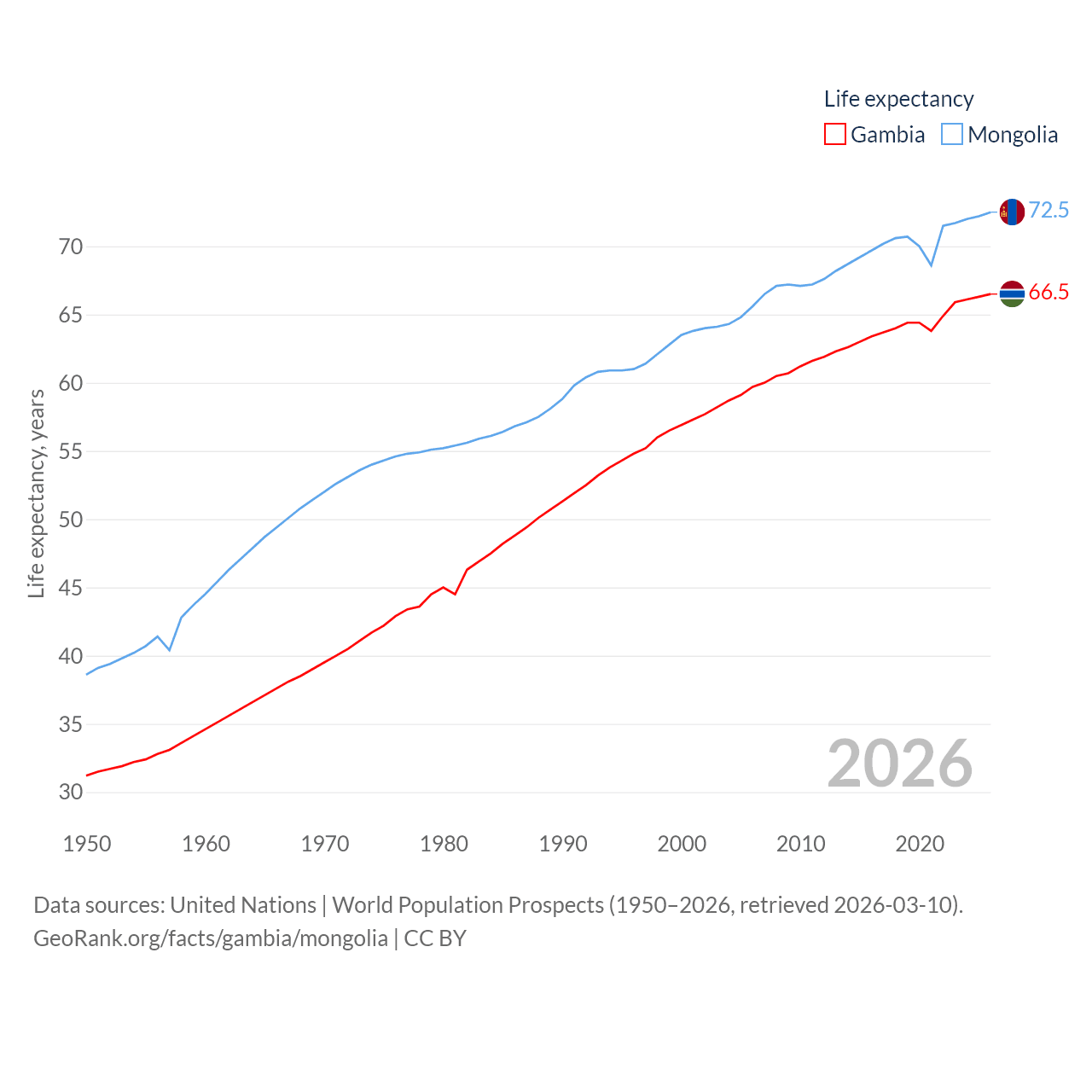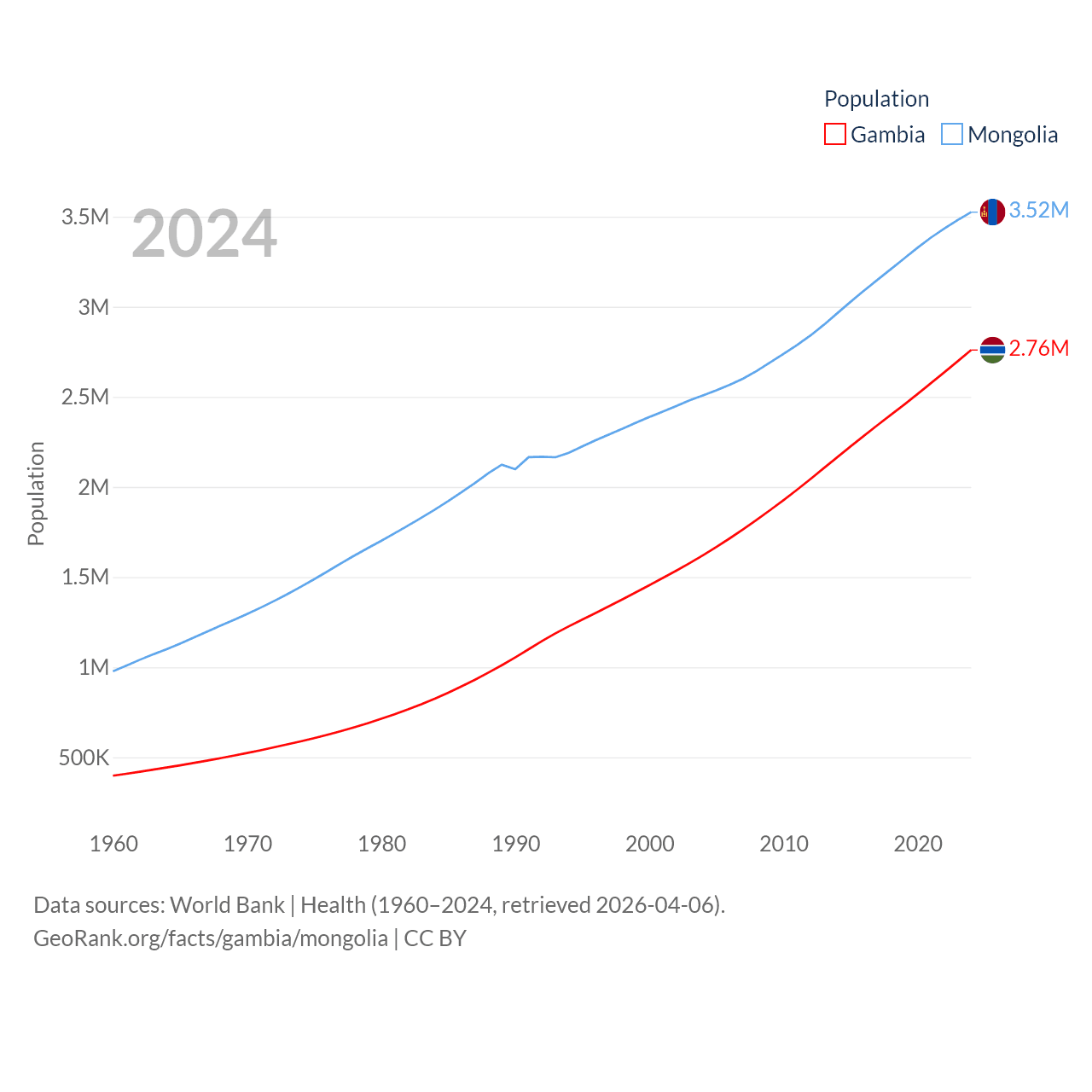 The Gambia has a population of 2.76M (ranked 140/197), compared with 3.52M in Mongolia (ranked 132/197). The Gambia's land area is 3,907 sq mi versus 601,740 sq mi for Mongolia (ranked 161st vs. 18th).