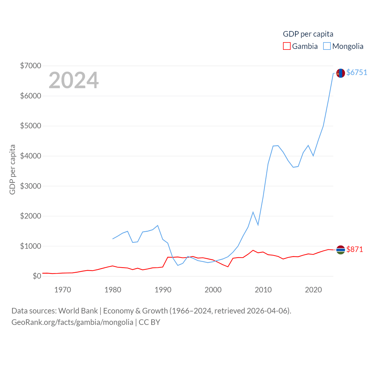 By GDP, The Gambia ranks 174/197 ($2.4B) and Mongolia ranks 121/197 ($23.8B). By GDP per capita, The Gambia ranks 183/197 ($871), while Mongolia ranks 105/197 ($6,751).