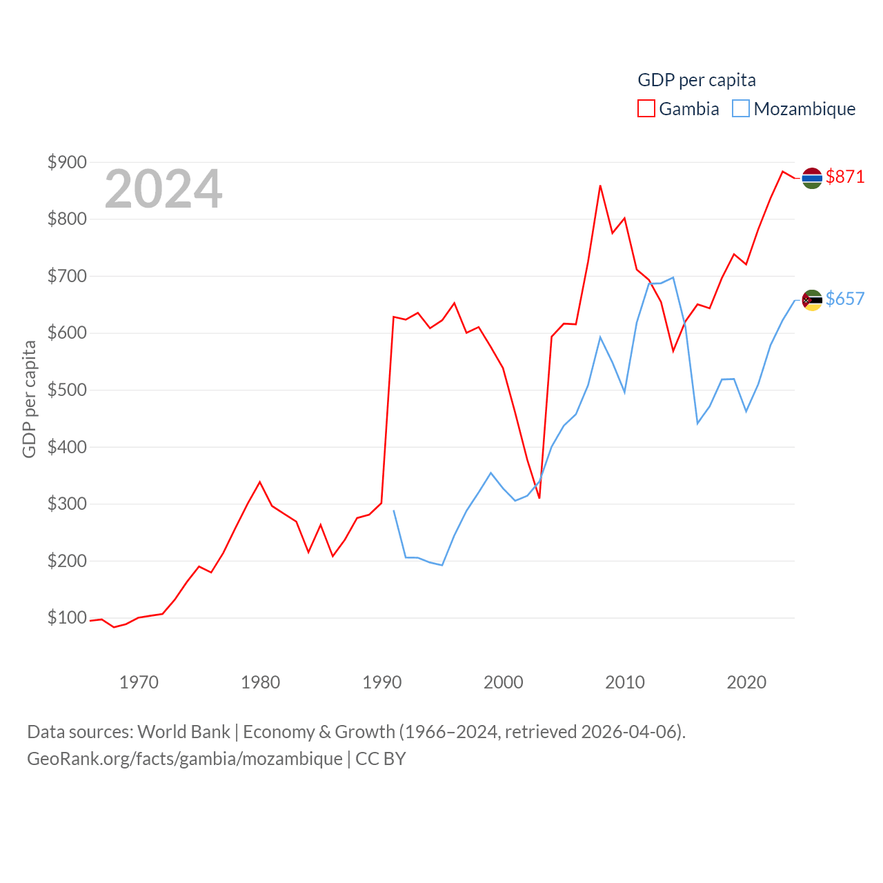 By GDP, The Gambia ranks 174/197 ($2.4B) and Mozambique ranks 123/197 ($22.7B). By GDP per capita, The Gambia ranks 183/197 ($871), while Mozambique ranks 189/197 ($657).