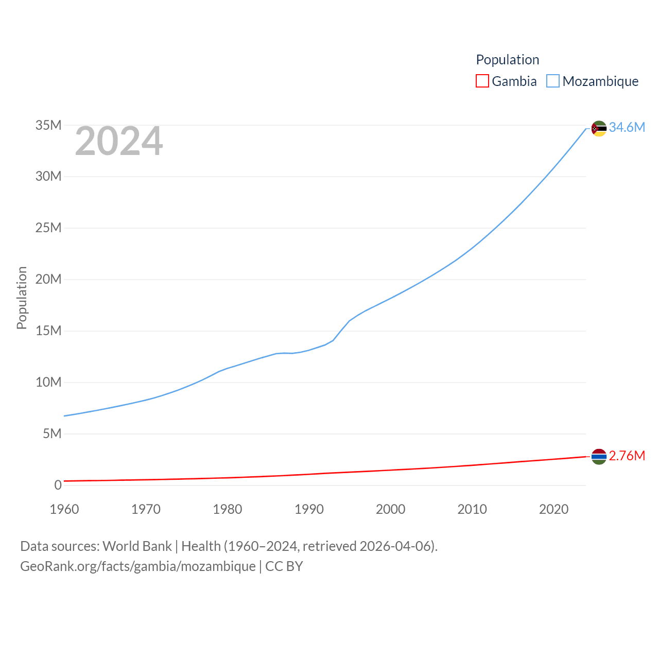 The Gambia has a population of 2.76M (ranked 140/197), compared with 34.6M in Mozambique (ranked 46/197). The Gambia's land area is 3,907 sq mi versus 303,623 sq mi for Mozambique (ranked 161st vs. 34th).