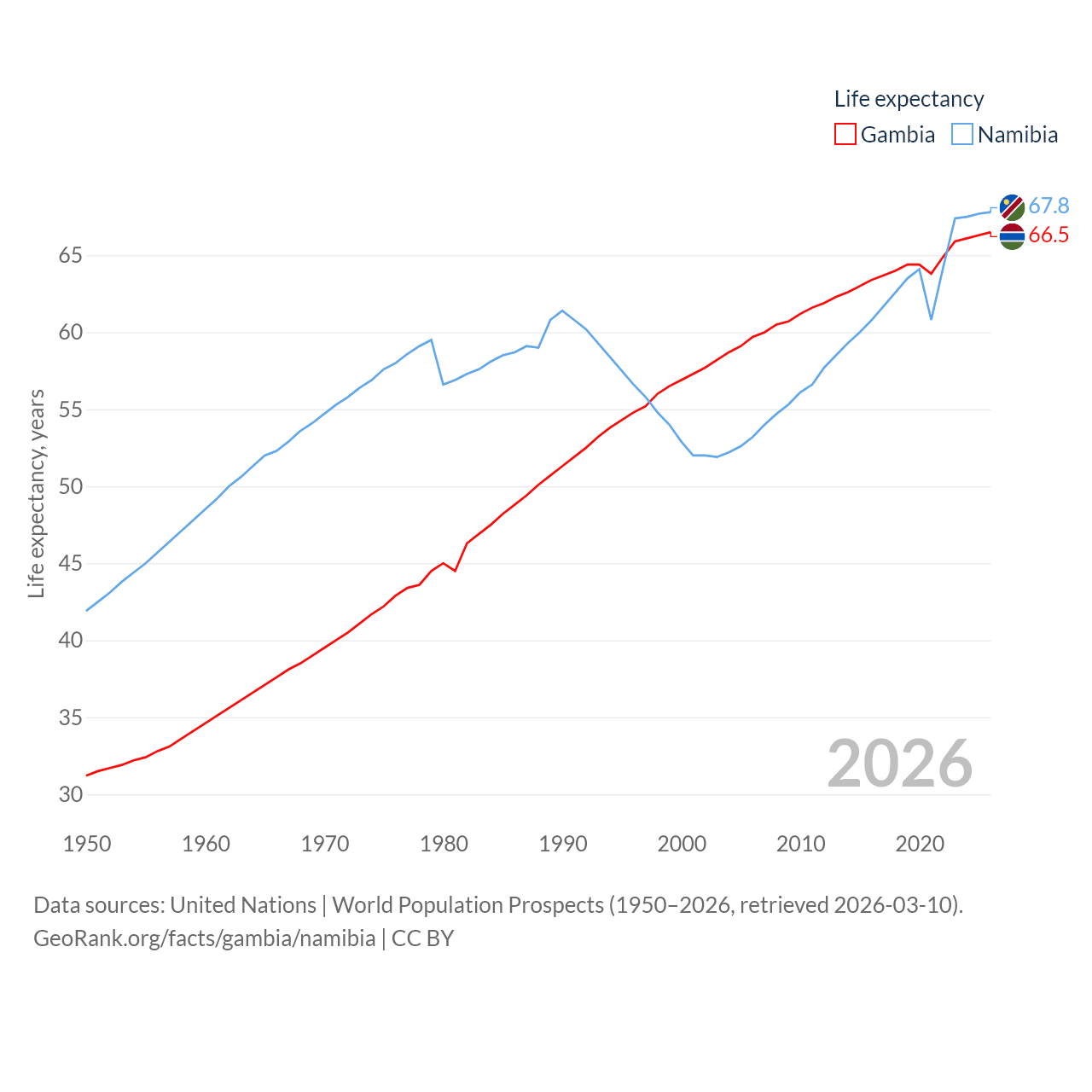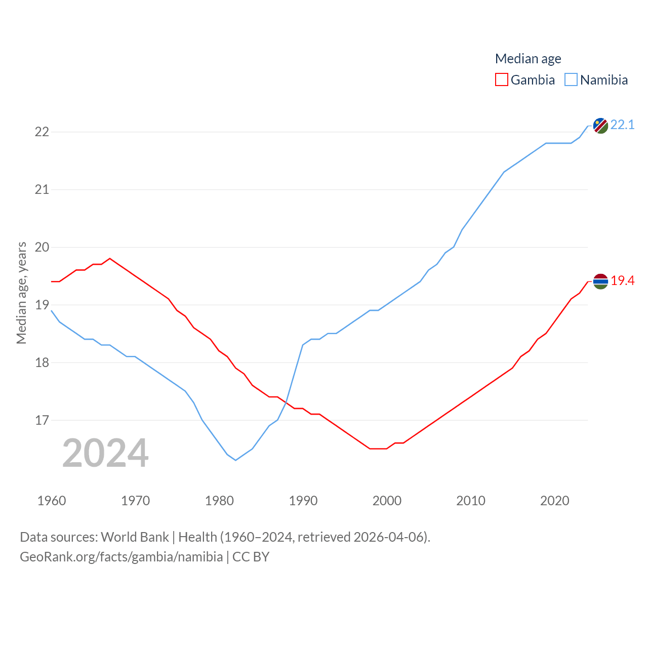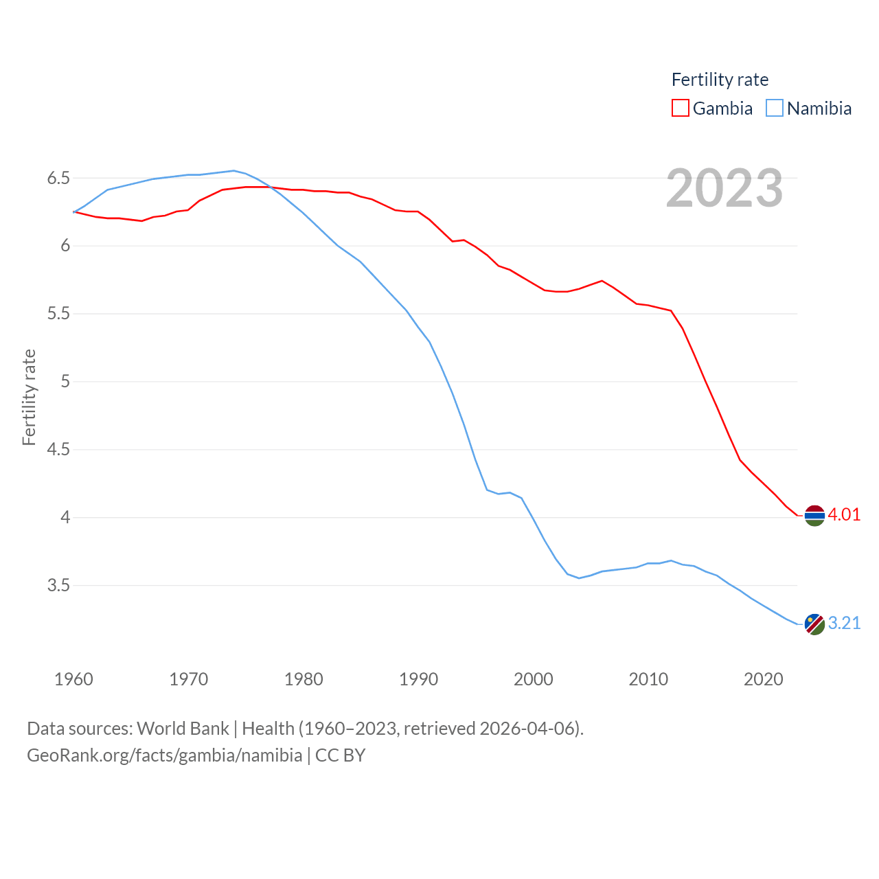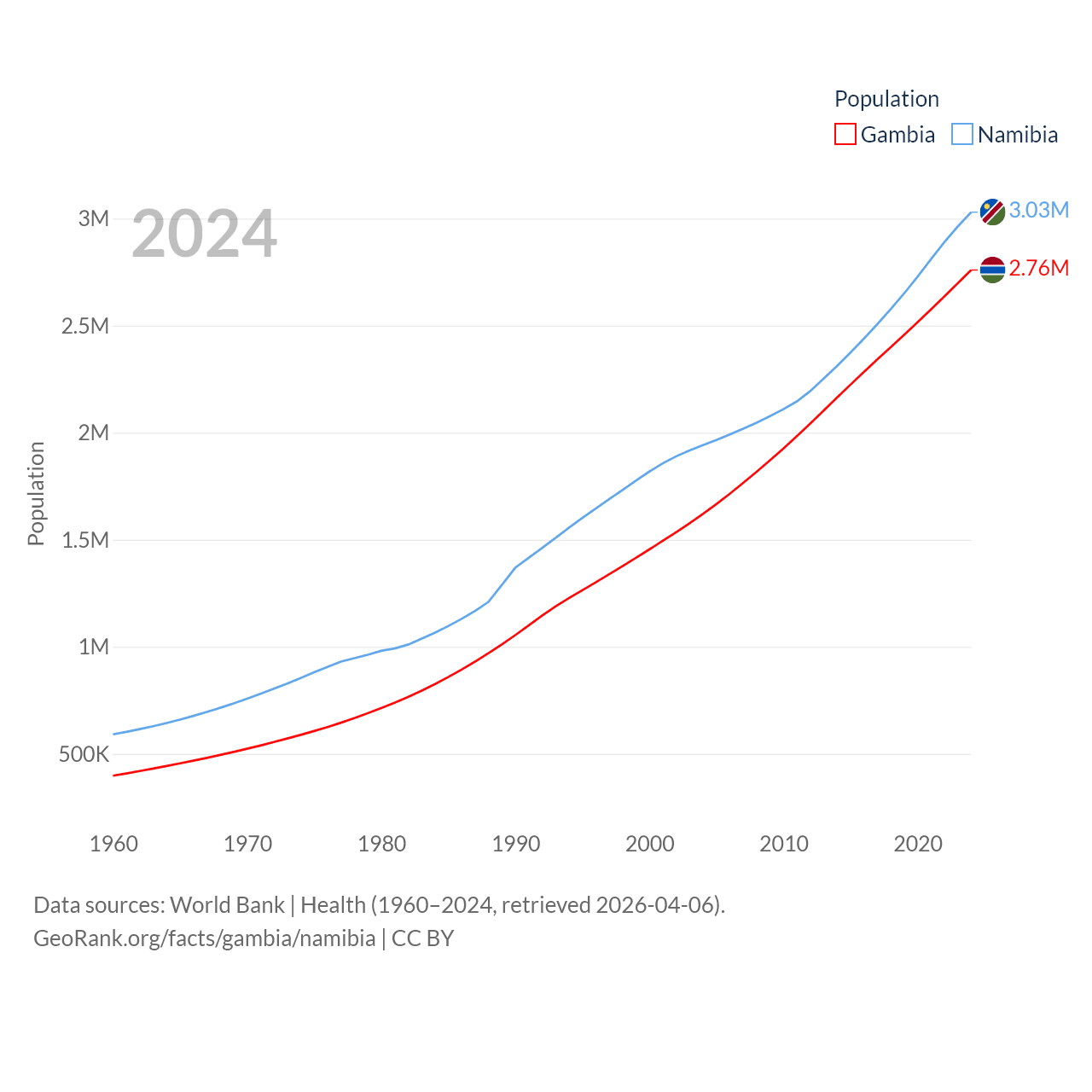 The Gambia has a population of 2.76M (ranked 140/197), compared with 3.03M in Namibia (ranked 136/197). The Gambia's land area is 3,907 sq mi versus 317,874 sq mi for Namibia (ranked 161st vs. 33rd).