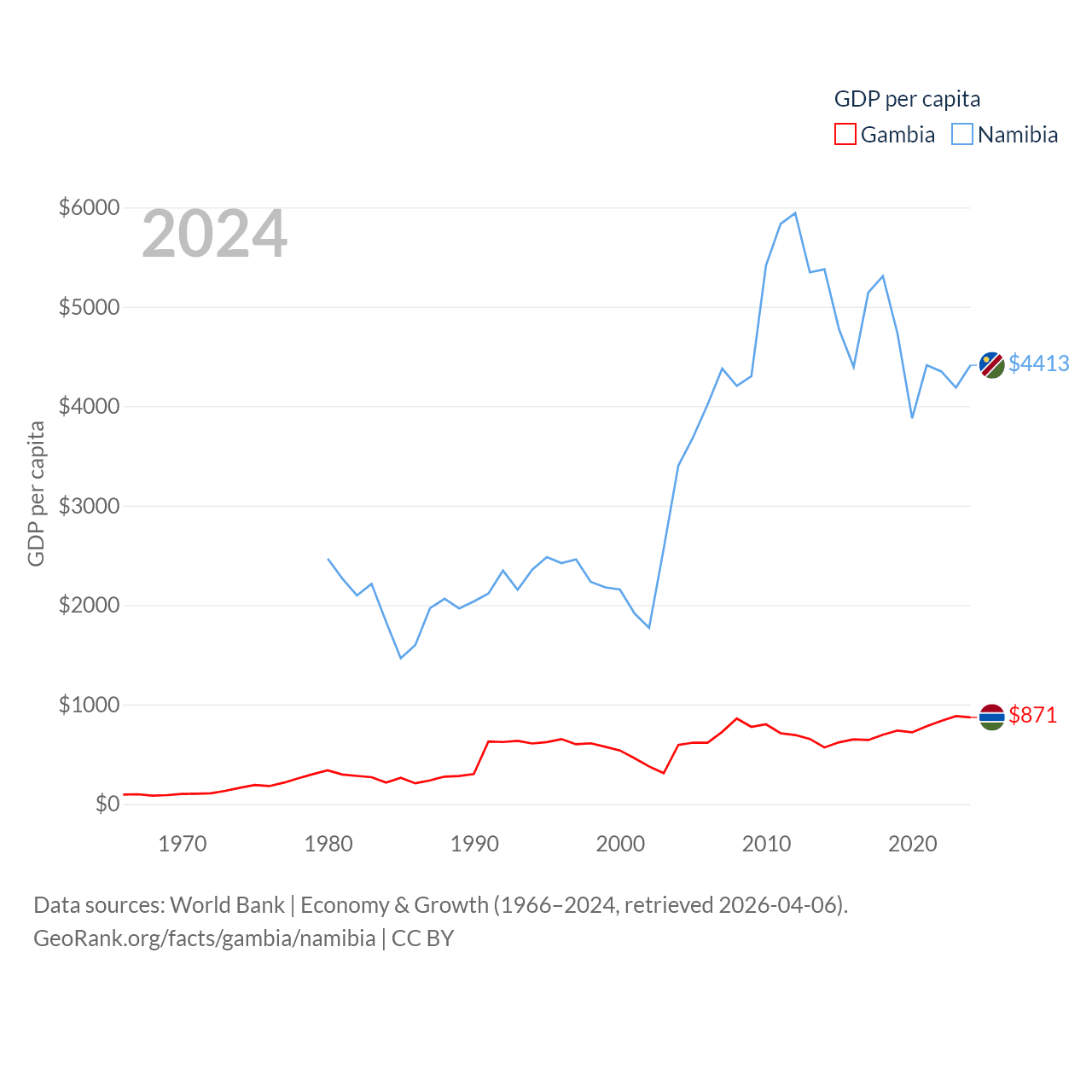 By GDP, The Gambia ranks 174/197 ($2.4B) and Namibia ranks 147/197 ($13.4B). By GDP per capita, The Gambia ranks 183/197 ($871), while Namibia ranks 126/197 ($4,413).
