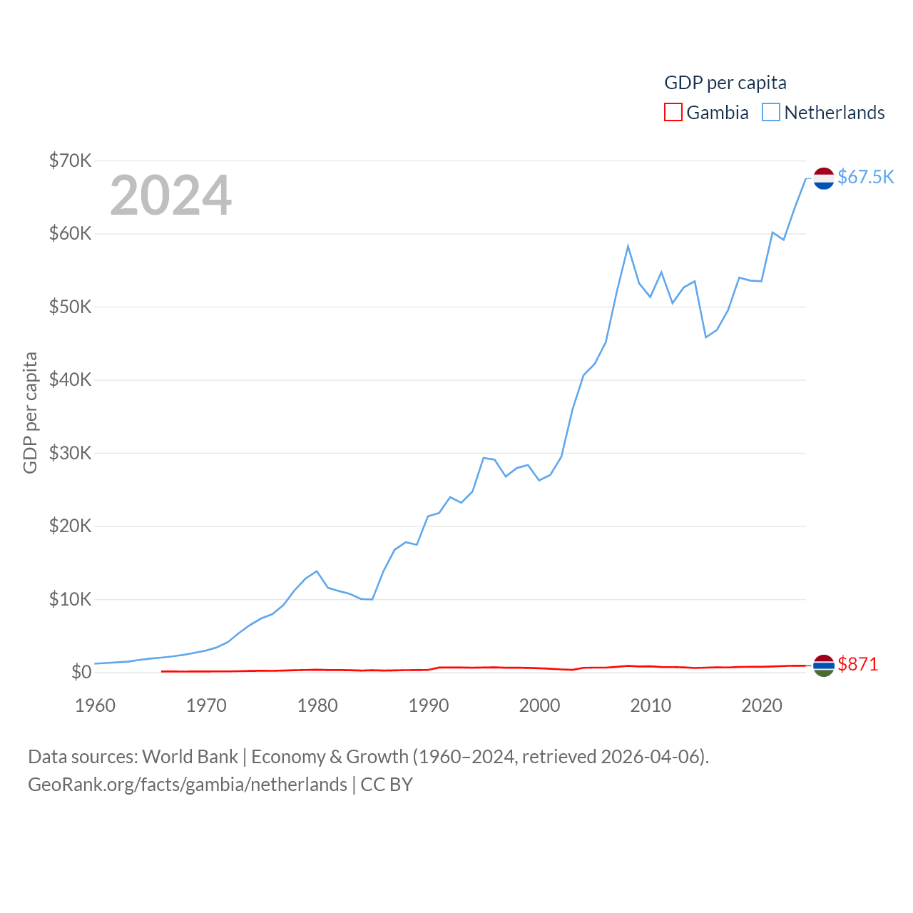 By GDP, The Gambia ranks 174/197 ($2.4B) and The Netherlands ranks 19/197 ($1.21T). By GDP per capita, The Gambia ranks 183/197 ($871), while The Netherlands ranks 13/197 ($67,520).