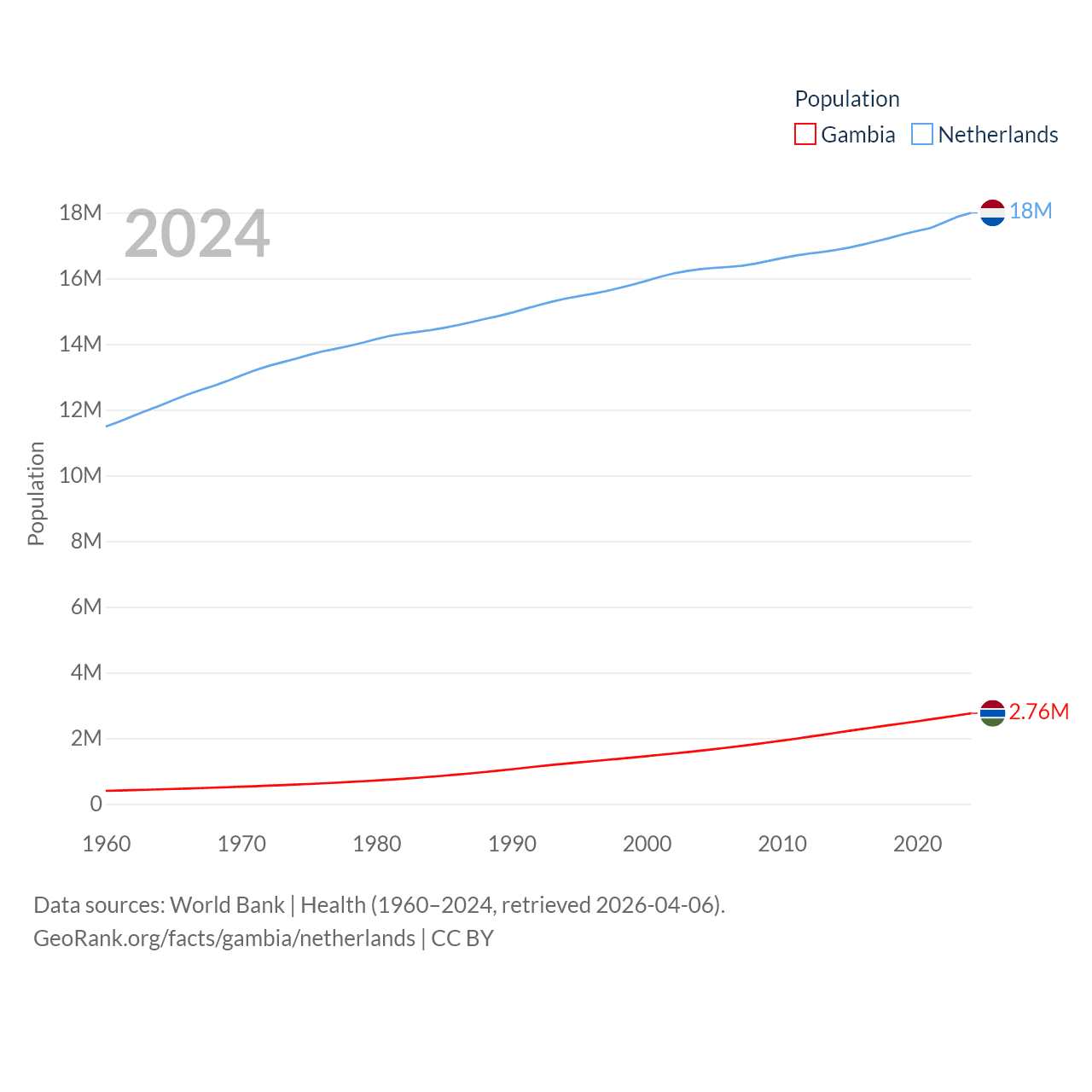 The Gambia has a population of 2.76M (ranked 140/197), compared with 18M in The Netherlands (ranked 72/197). The Gambia's land area is 3,907 sq mi versus 13,000 sq mi for The Netherlands (ranked 161st vs. 134th).