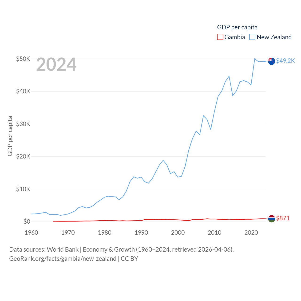 By GDP, The Gambia ranks 174/197 ($2.4B) and New Zealand ranks 52/197 ($260B). By GDP per capita, The Gambia ranks 183/197 ($871), while New Zealand ranks 26/197 ($49,205).