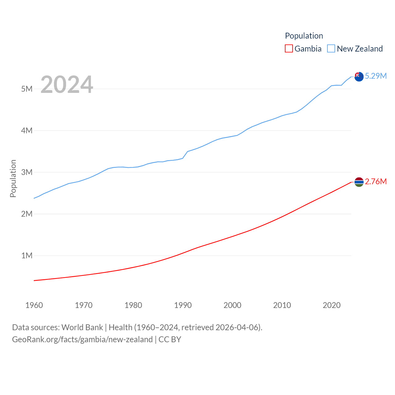 The Gambia has a population of 2.76M (ranked 140/197), compared with 5.29M in New Zealand (ranked 123/197). The Gambia's land area is 3,907 sq mi versus 101,665 sq mi for New Zealand (ranked 161st vs. 74th).