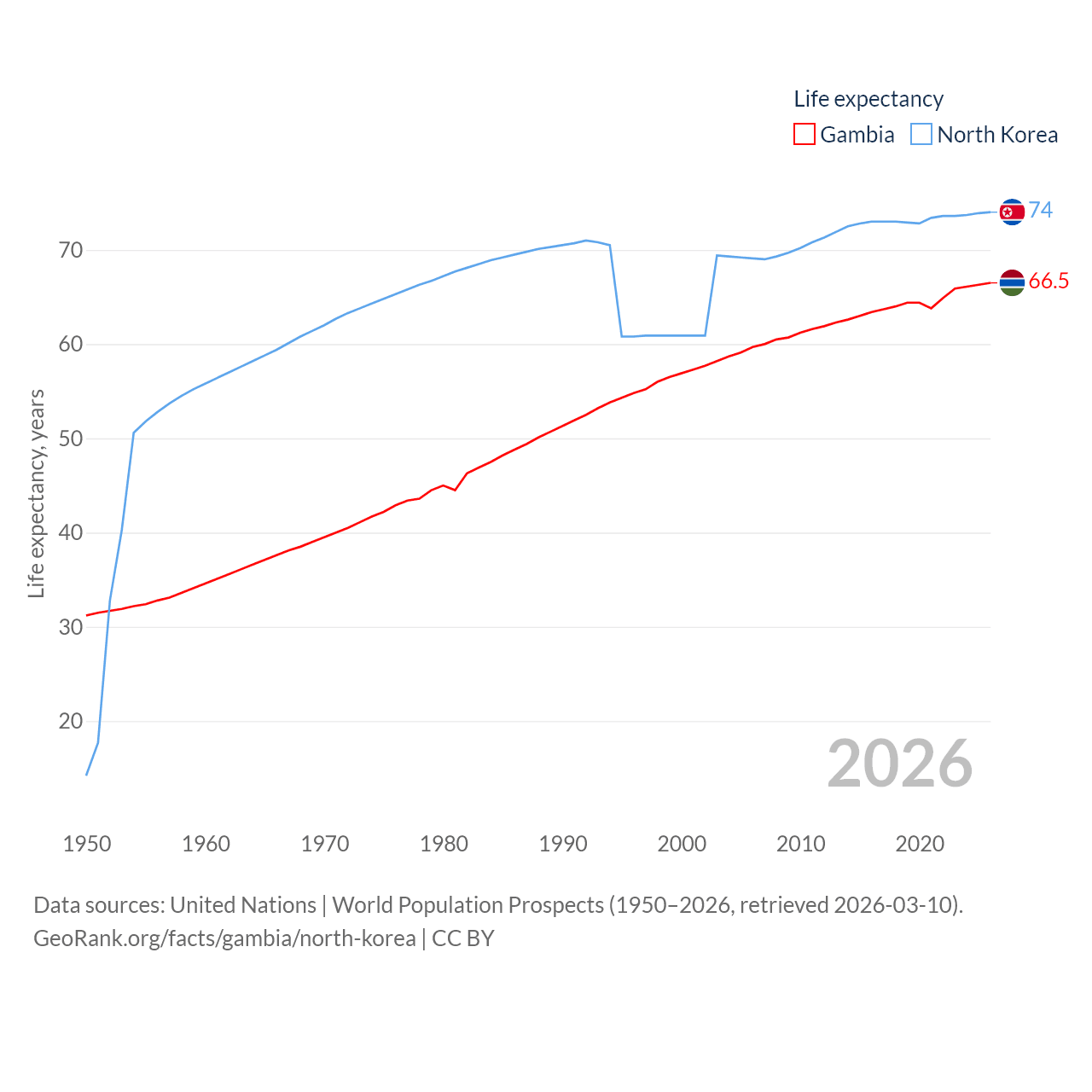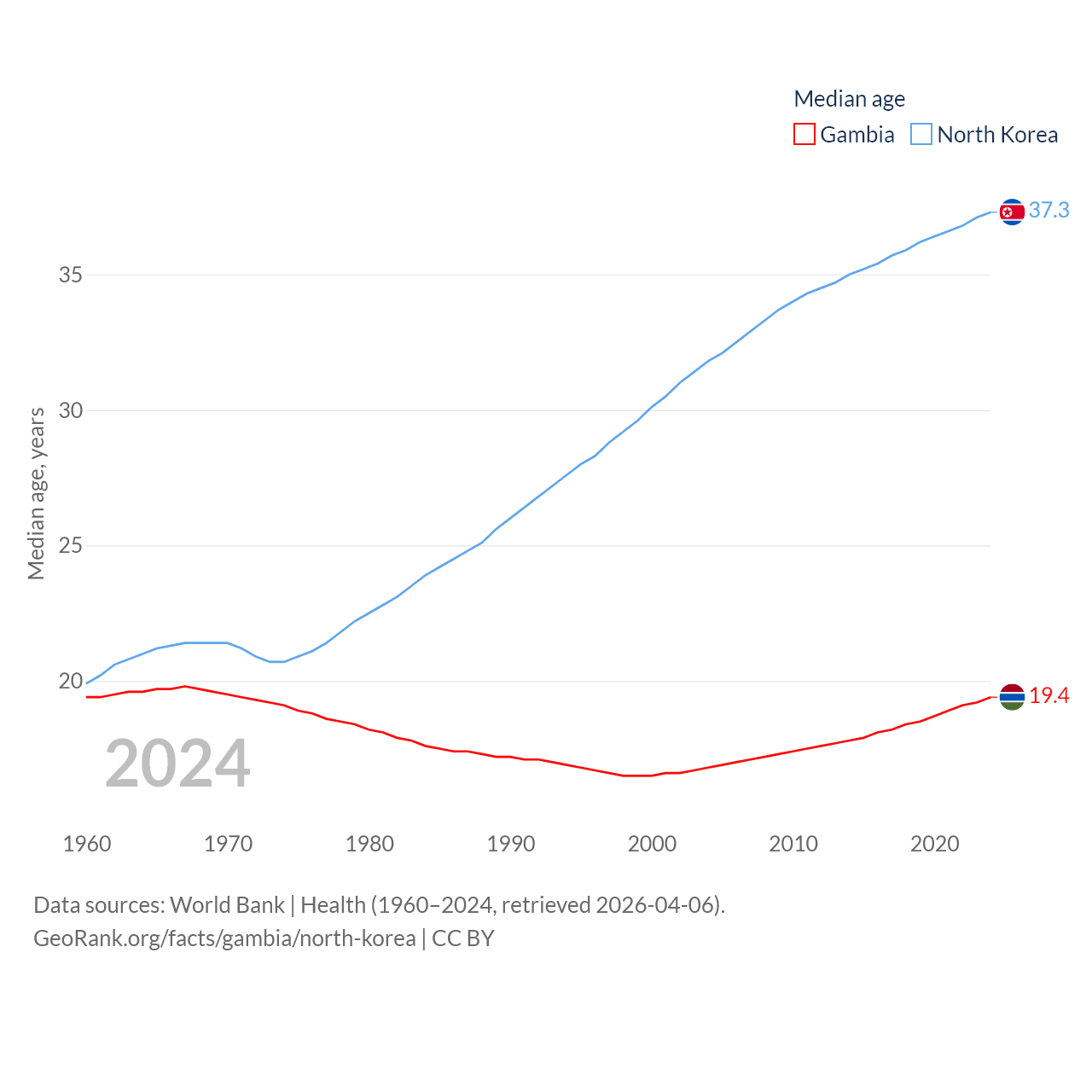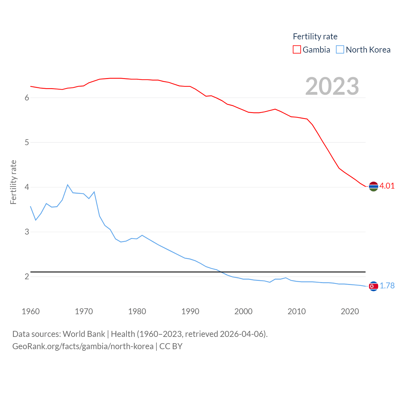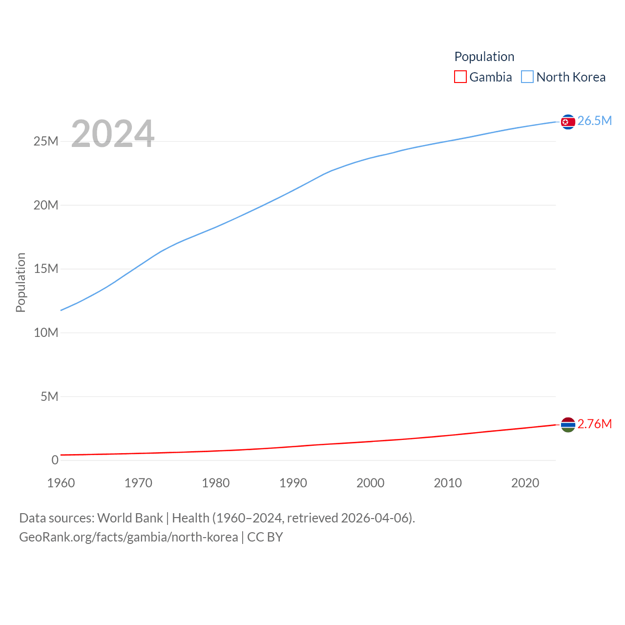 The Gambia has a population of 2.76M (ranked 140/197), compared with 26.5M in North Korea (ranked 56/197). The Gambia's land area is 3,907 sq mi versus 46,491 sq mi for North Korea (ranked 161st vs. 97th).