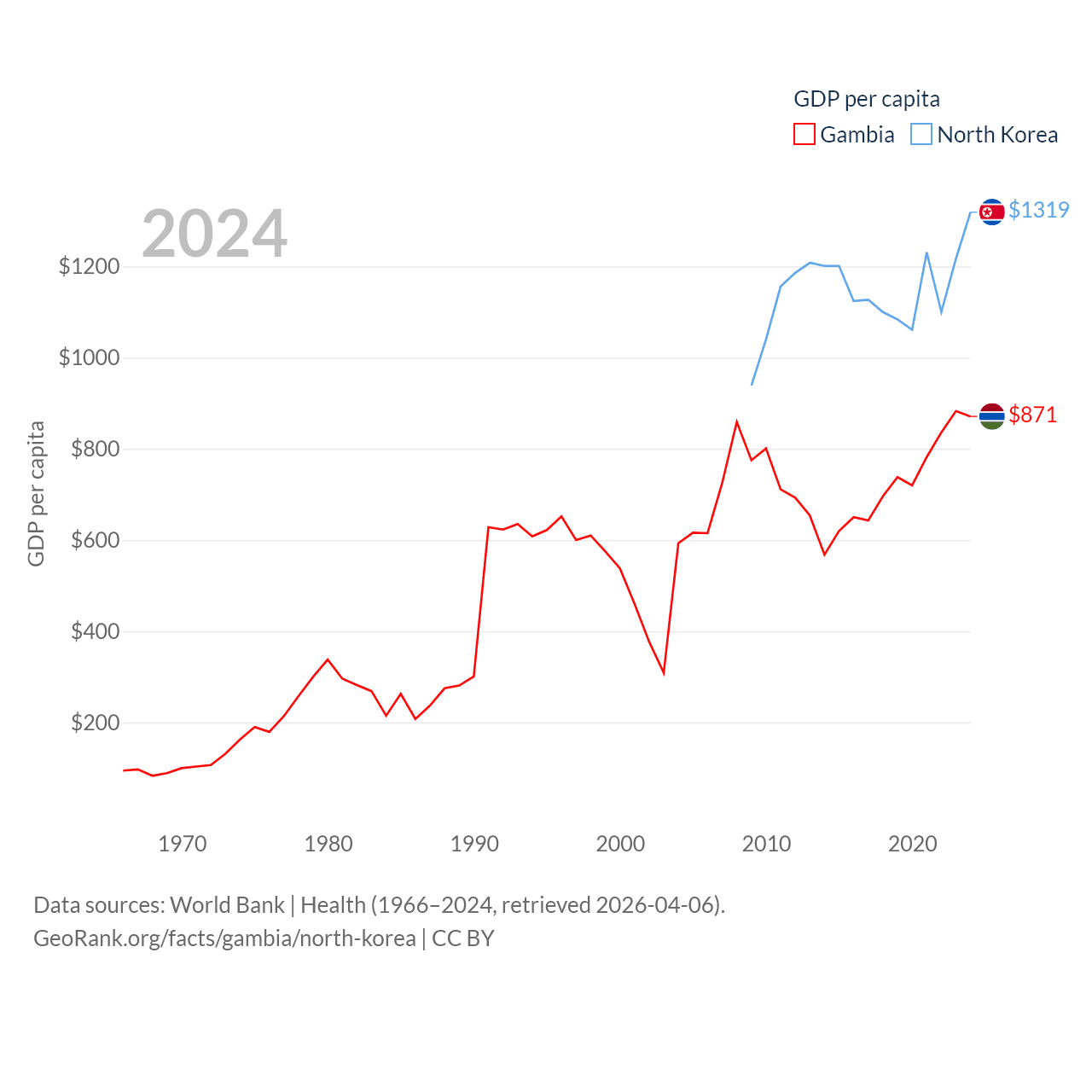 By GDP, The Gambia ranks 174/197 ($2.4B) and North Korea ranks 106/197 ($34.9B). By GDP per capita, The Gambia ranks 183/197 ($871), while North Korea ranks 168/197 ($1,319).