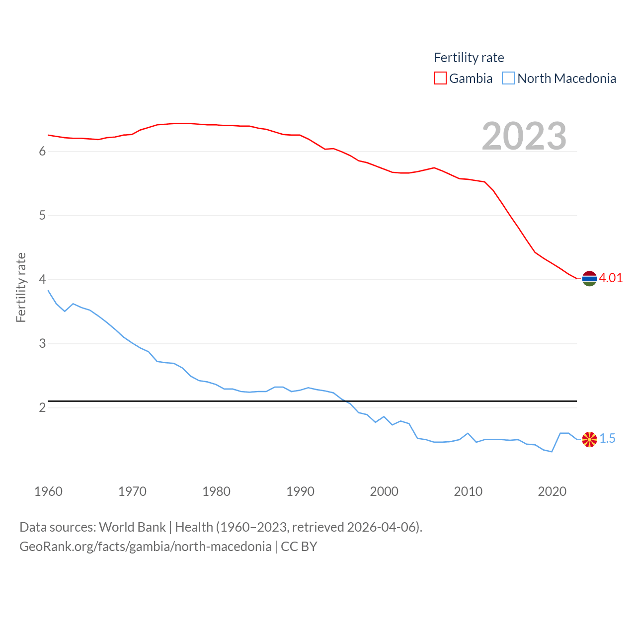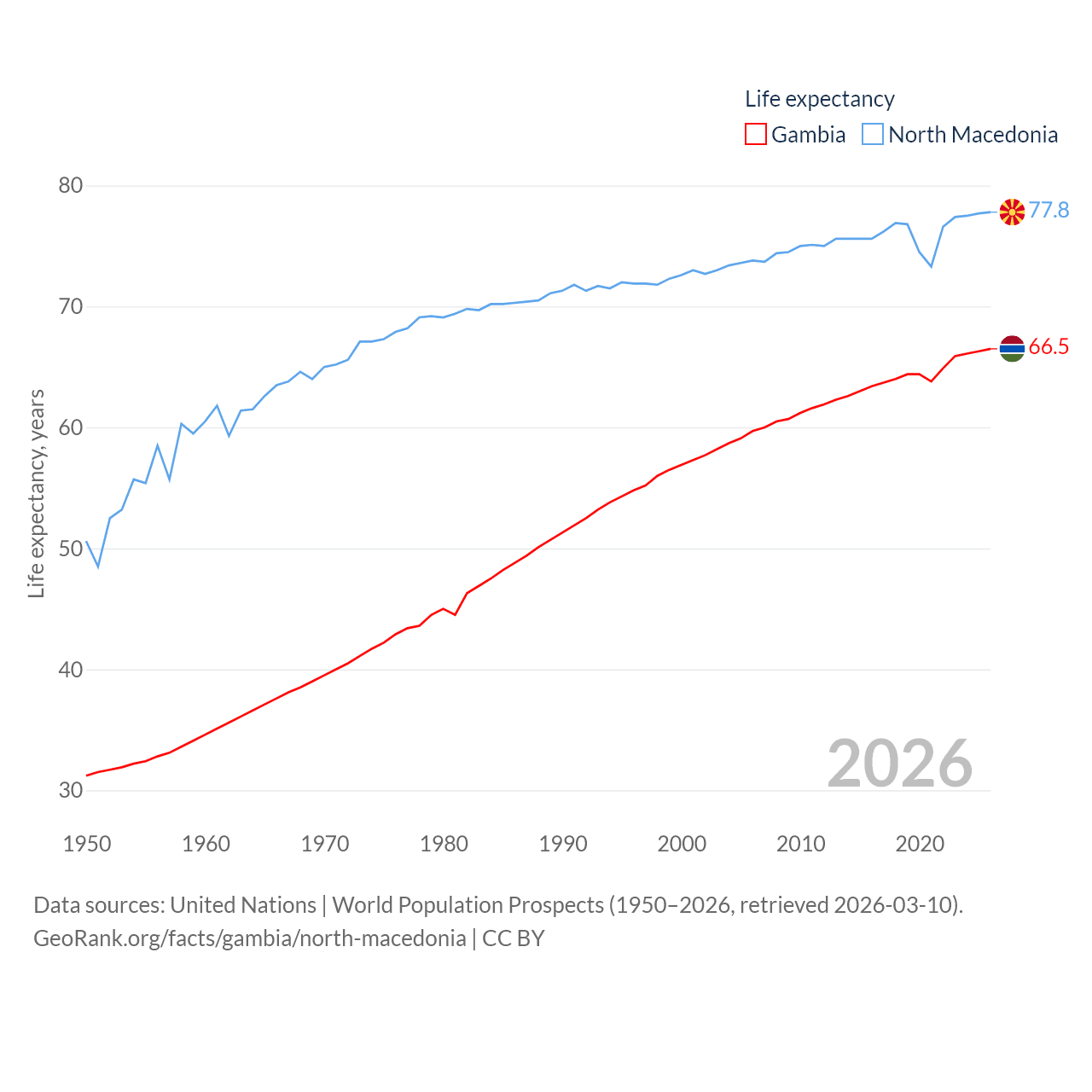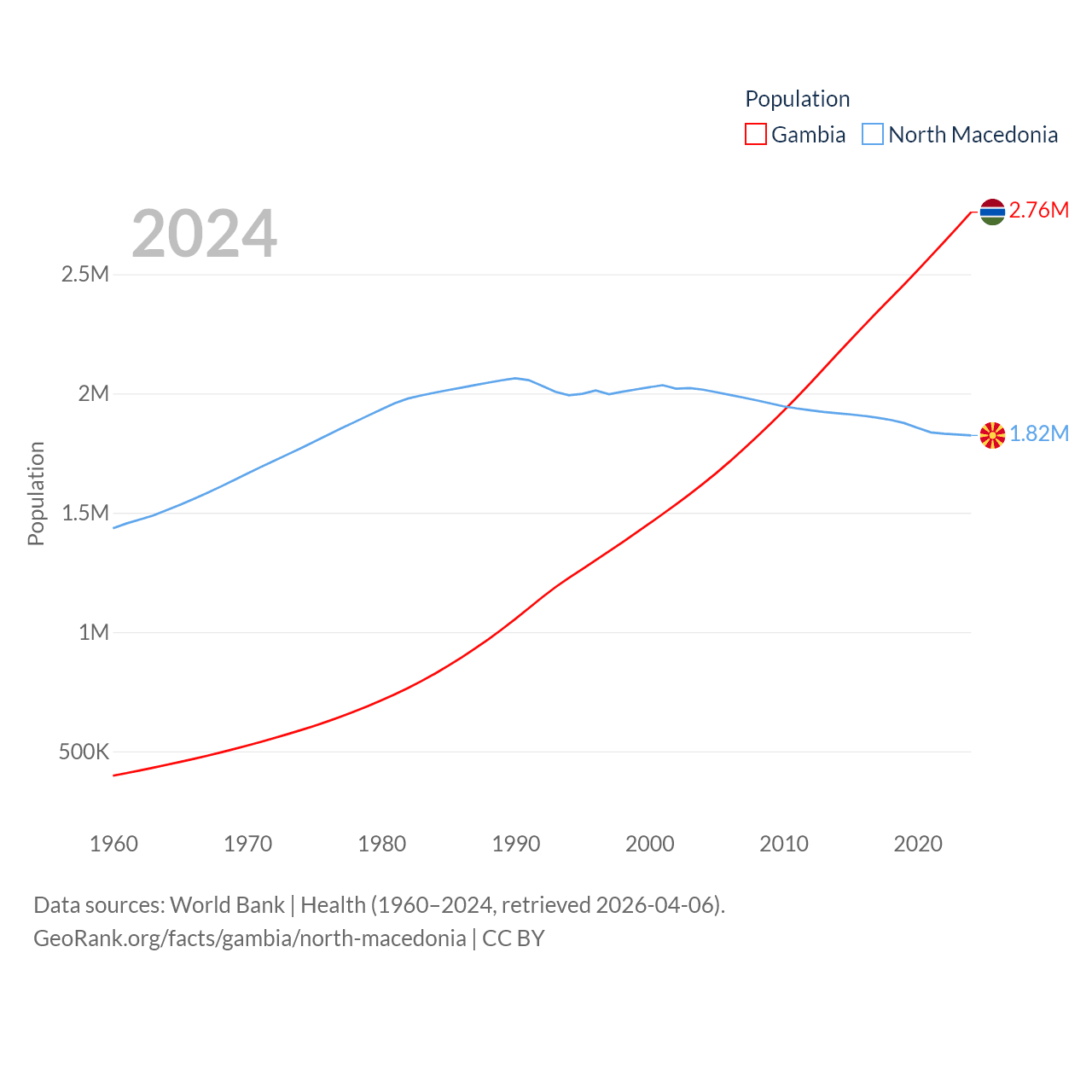 The Gambia has a population of 2.76M (ranked 140/197), compared with 1.82M in North Macedonia (ranked 150/197). The Gambia's land area is 3,907 sq mi versus 9,737 sq mi for North Macedonia (ranked 161st vs. 145th).
