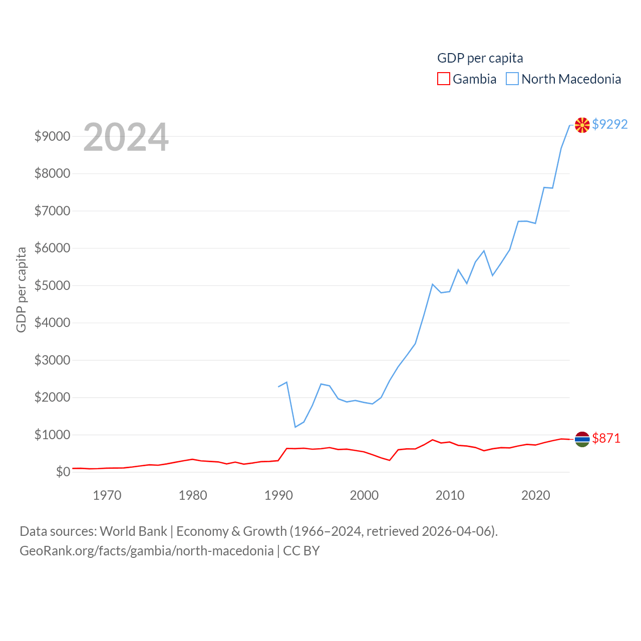 By GDP, The Gambia ranks 174/197 ($2.4B) and North Macedonia ranks 138/197 ($17B). By GDP per capita, The Gambia ranks 183/197 ($871), while North Macedonia ranks 88/197 ($9,292).