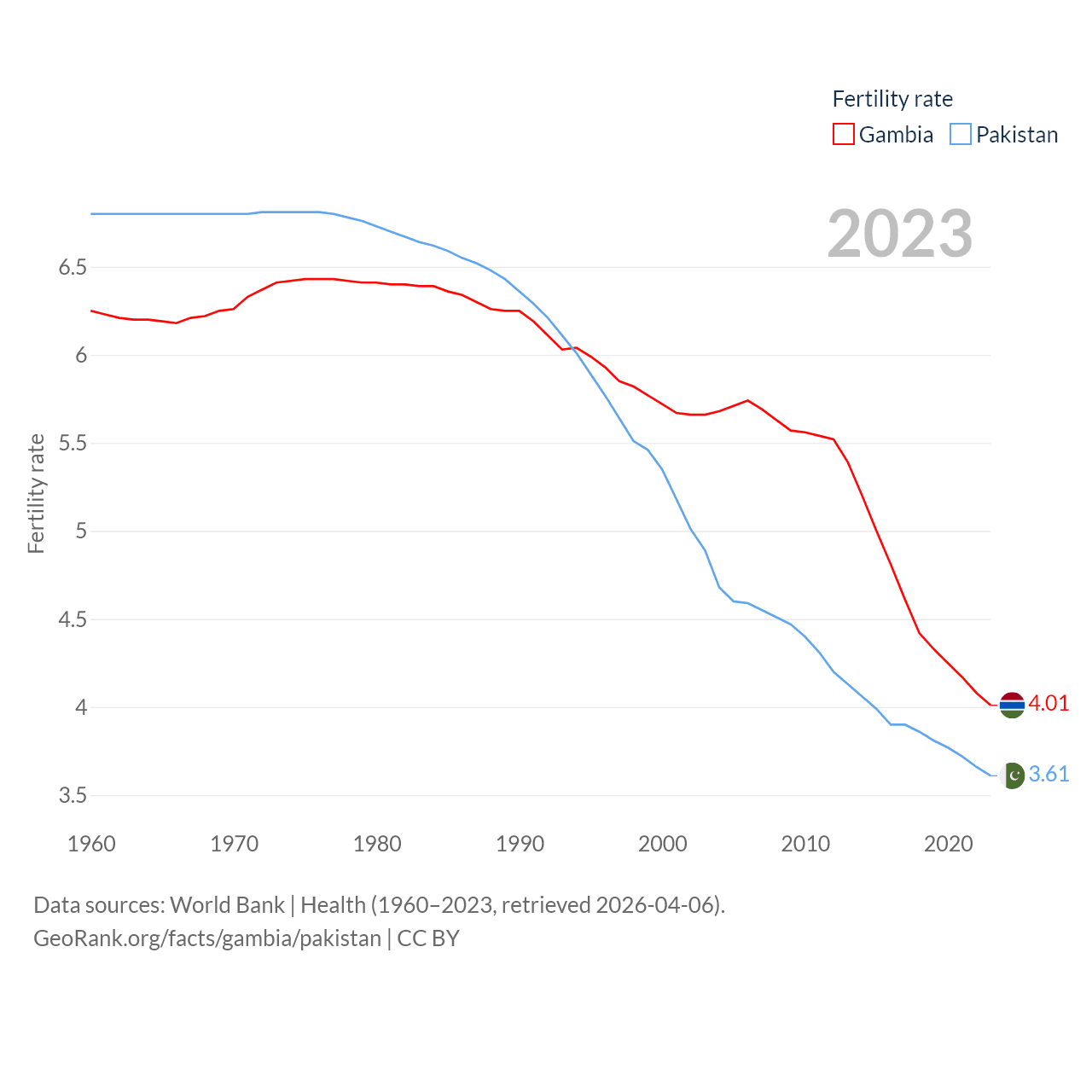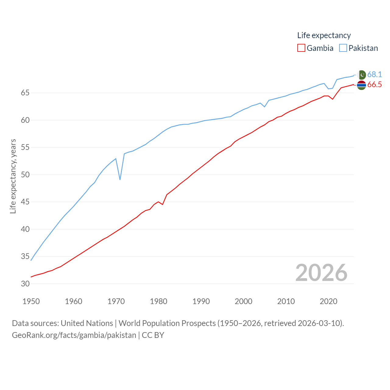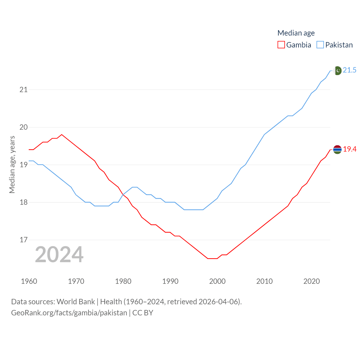 The Gambia has a population of 2.76M (ranked 140/197), compared with 251M in Pakistan (ranked 5/197). The Gambia's land area is 3,907 sq mi versus 297,638 sq mi for Pakistan (ranked 161st vs. 35th).