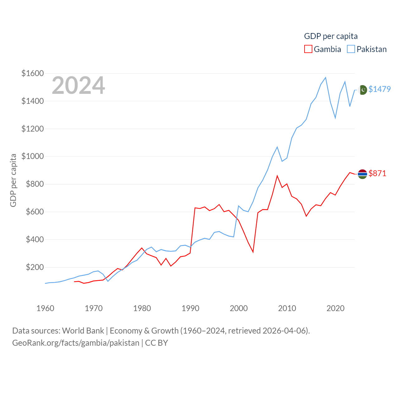 By GDP, The Gambia ranks 174/197 ($2.4B) and Pakistan ranks 43/197 ($372B). By GDP per capita, The Gambia ranks 183/197 ($871), while Pakistan ranks 163/197 ($1,479).