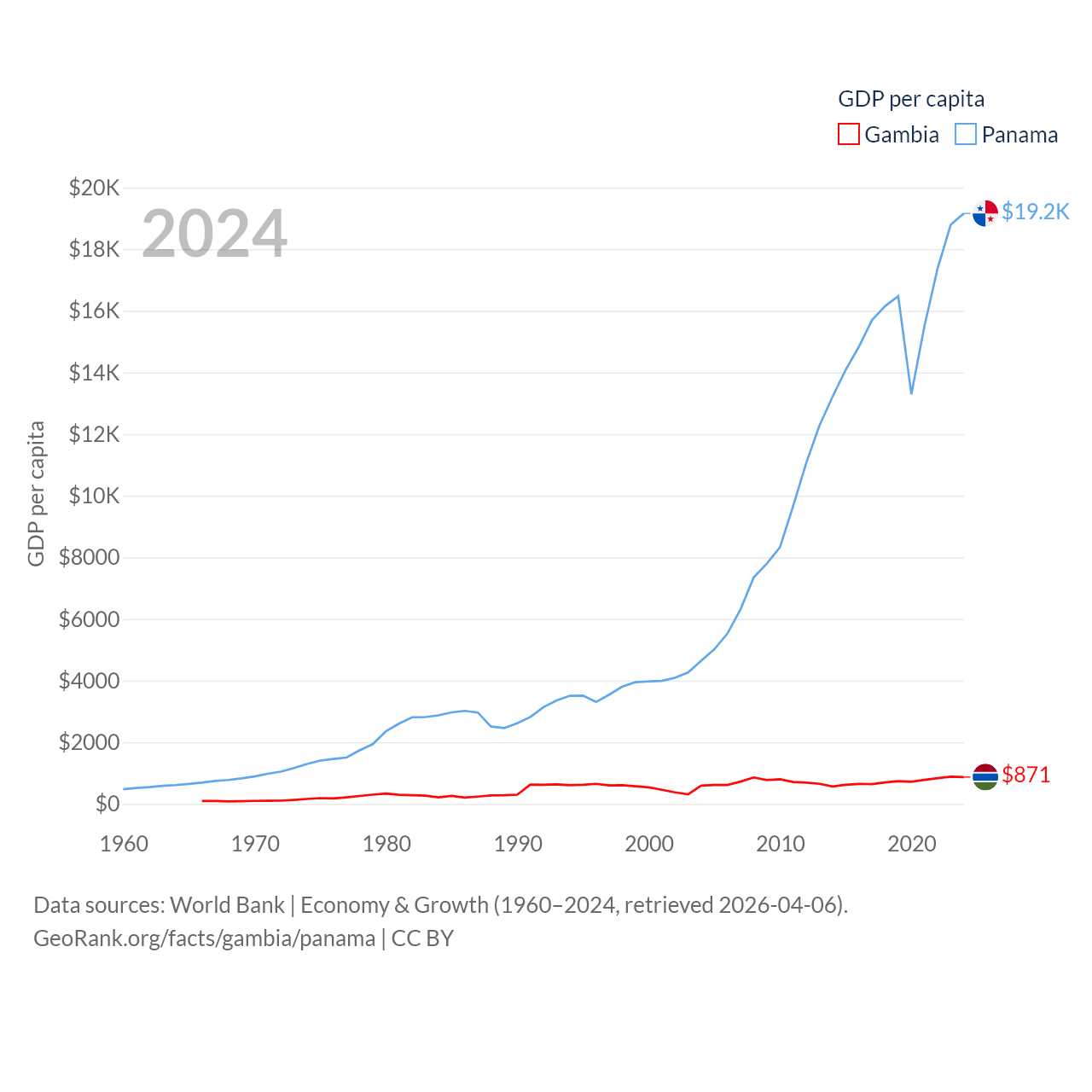 By GDP, The Gambia ranks 174/197 ($2.4B) and Panama ranks 78/197 ($86.5B). By GDP per capita, The Gambia ranks 183/197 ($871), while Panama ranks 60/197 ($19,161).