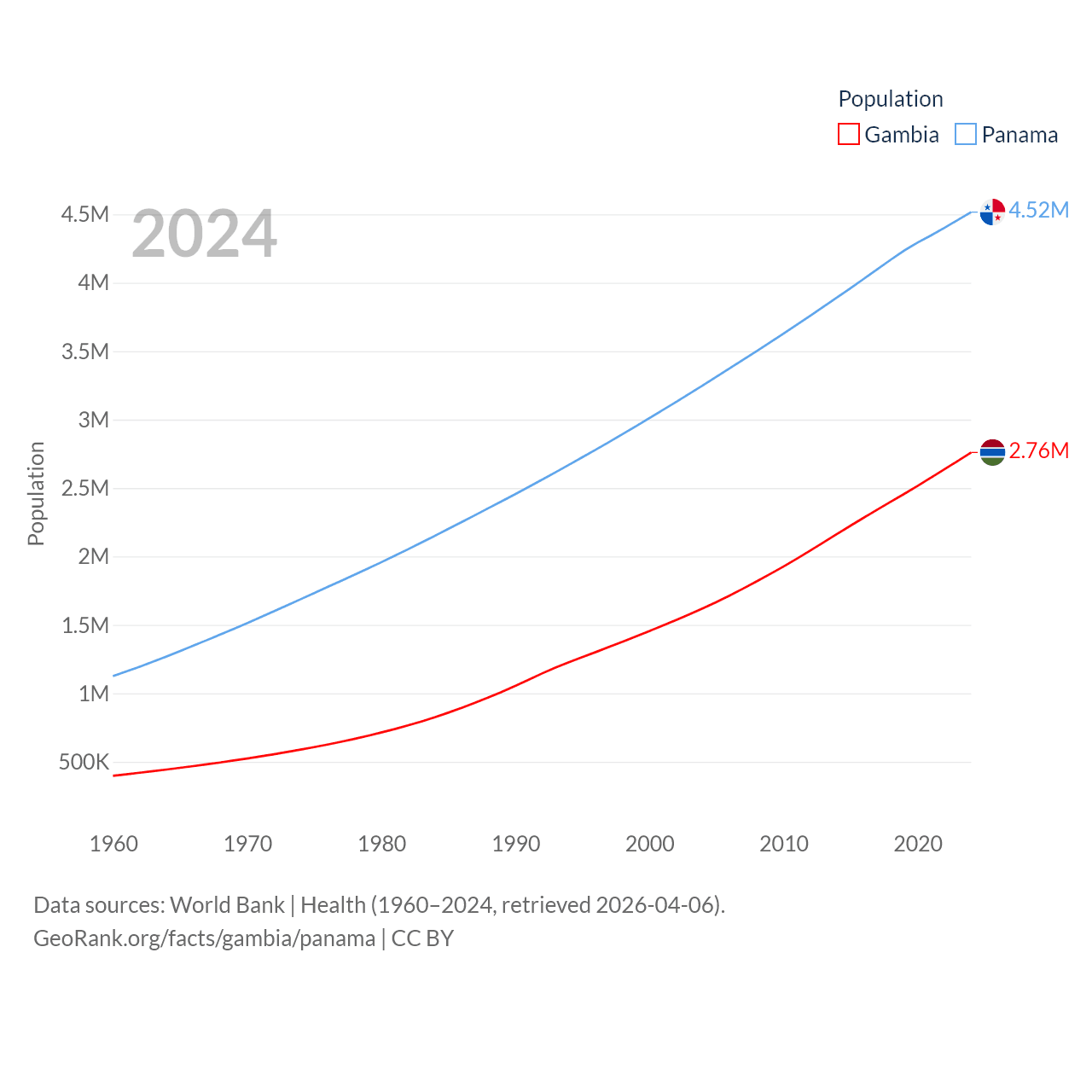 The Gambia has a population of 2.76M (ranked 140/197), compared with 4.52M in Panama (ranked 128/197). The Gambia's land area is 3,907 sq mi versus 28,641 sq mi for Panama (ranked 161st vs. 115th).