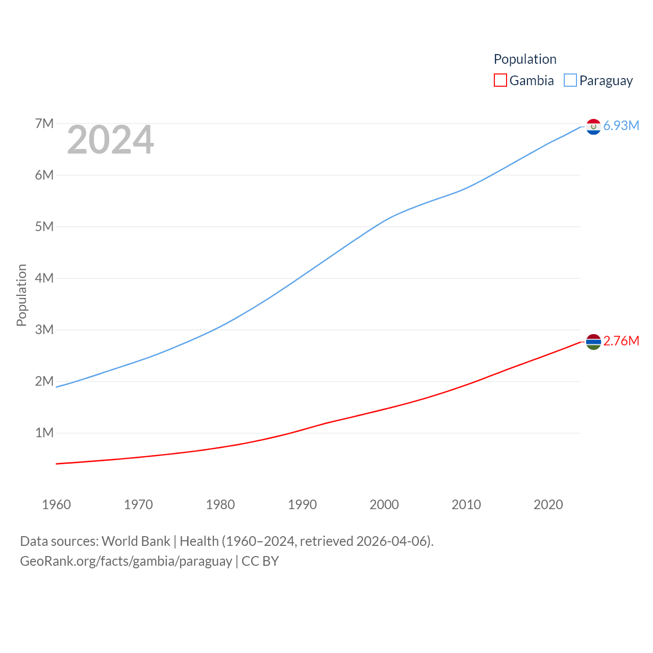 The Gambia has a population of 2.76M (ranked 140/197), compared with 6.93M in Paraguay (ranked 107/197). The Gambia's land area is 3,907 sq mi versus 152,901 sq mi for Paraguay (ranked 161st vs. 59th).