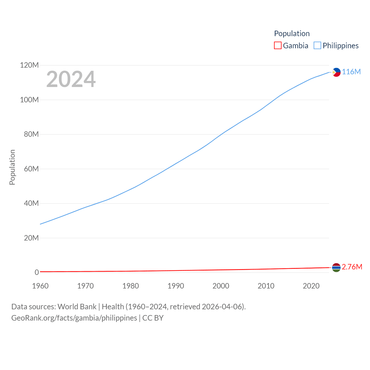 The Gambia has a population of 2.76M (ranked 140/197), compared with 116M in The Philippines (ranked 14/197). The Gambia's land area is 3,907 sq mi versus 115,124 sq mi for The Philippines (ranked 161st vs. 71st).