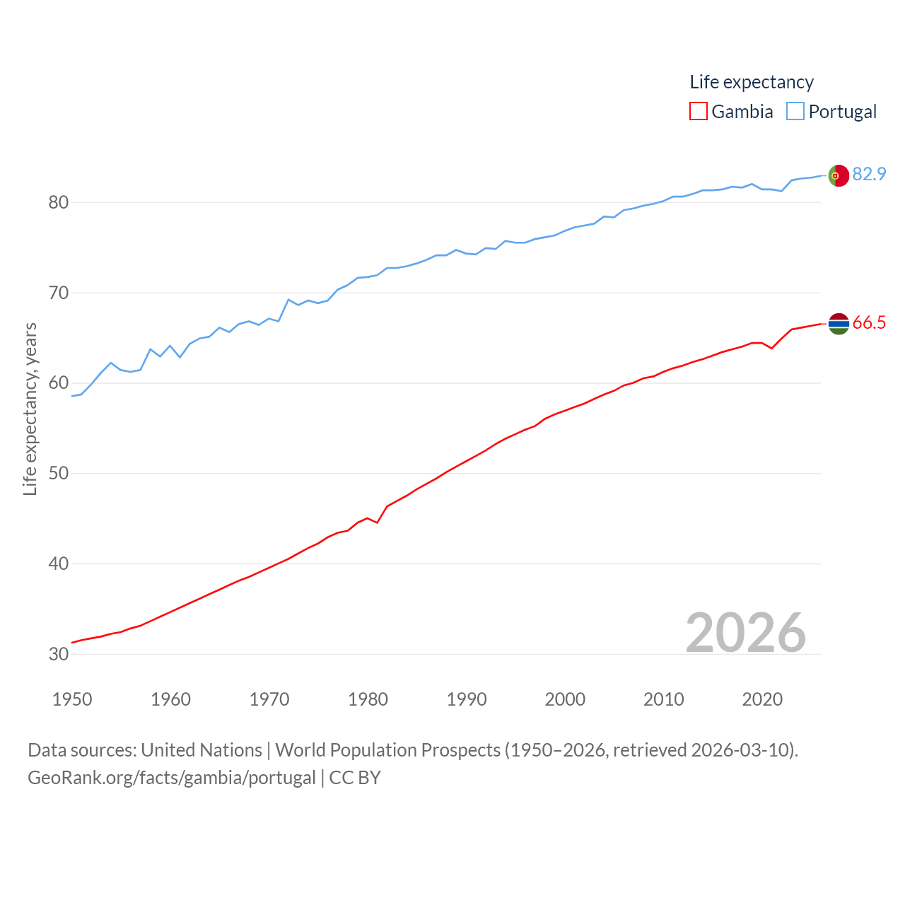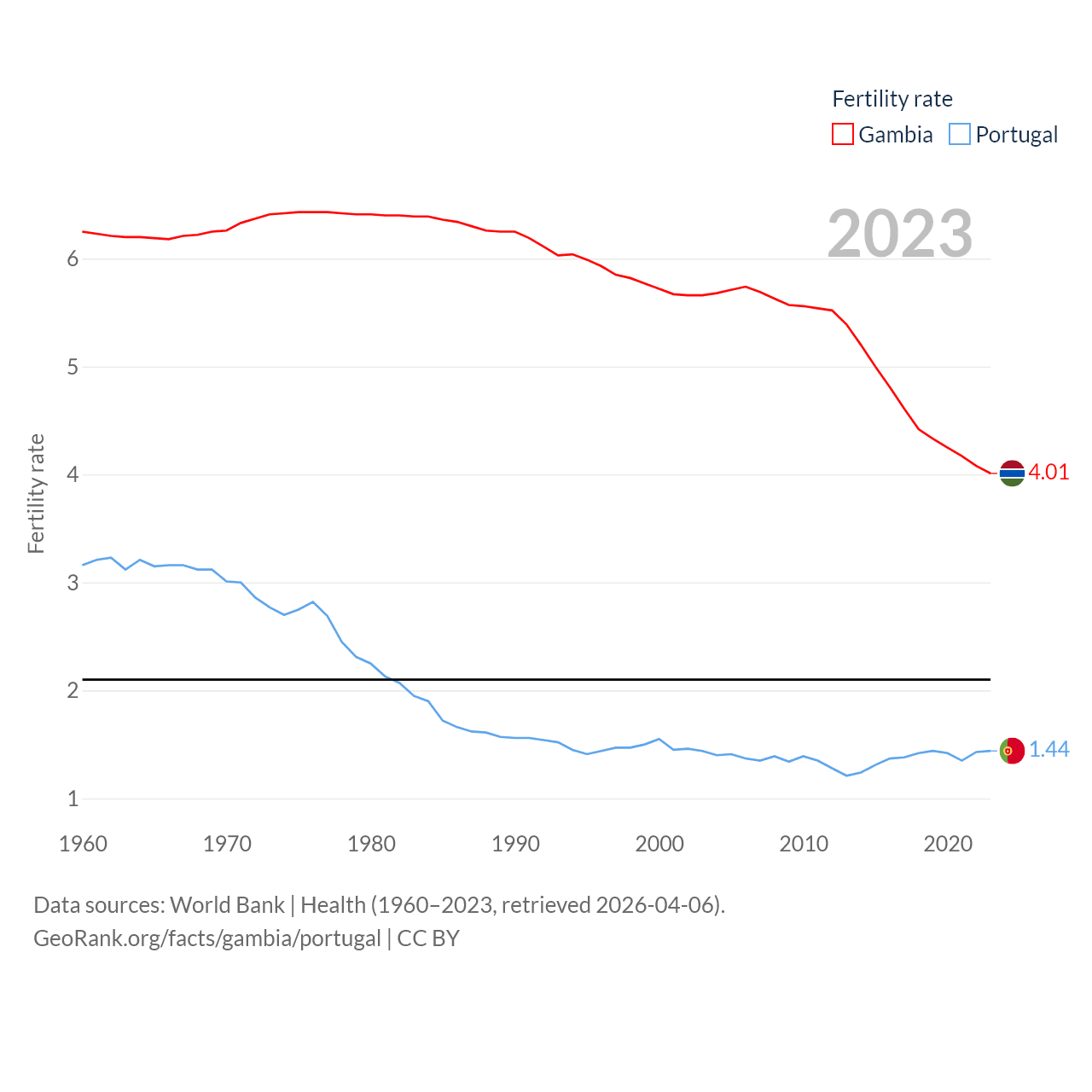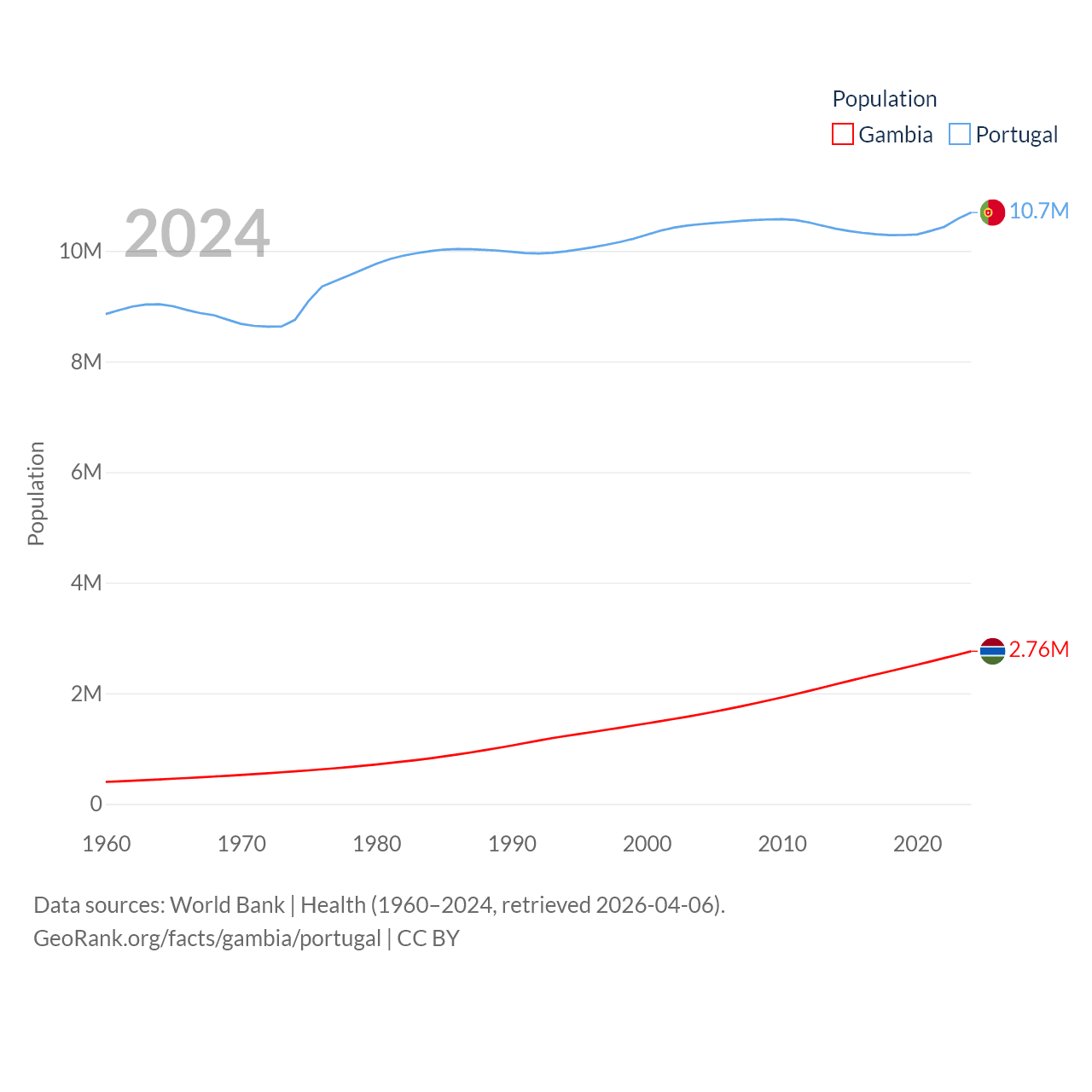 The Gambia has a population of 2.76M (ranked 140/197), compared with 10.7M in Portugal (ranked 90/197). The Gambia's land area is 3,907 sq mi versus 35,369 sq mi for Portugal (ranked 161st vs. 108th).