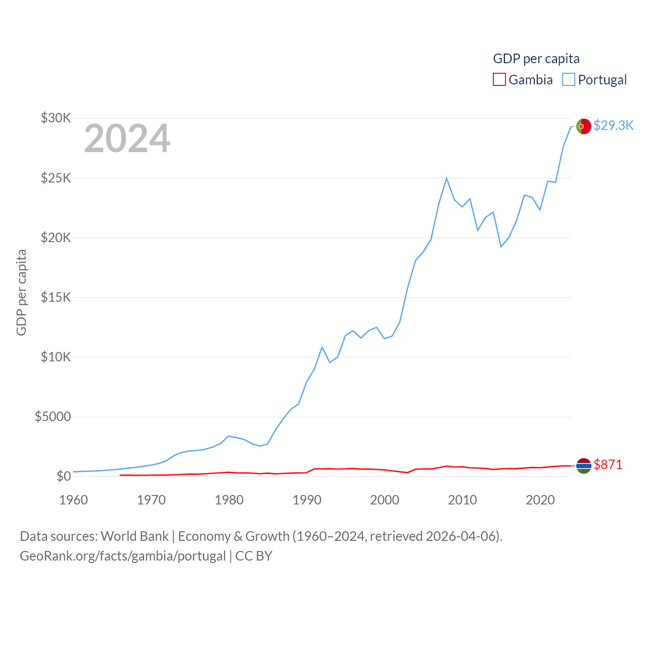 By GDP, The Gambia ranks 174/197 ($2.4B) and Portugal ranks 46/197 ($313B). By GDP per capita, The Gambia ranks 183/197 ($871), while Portugal ranks 44/197 ($29,292).