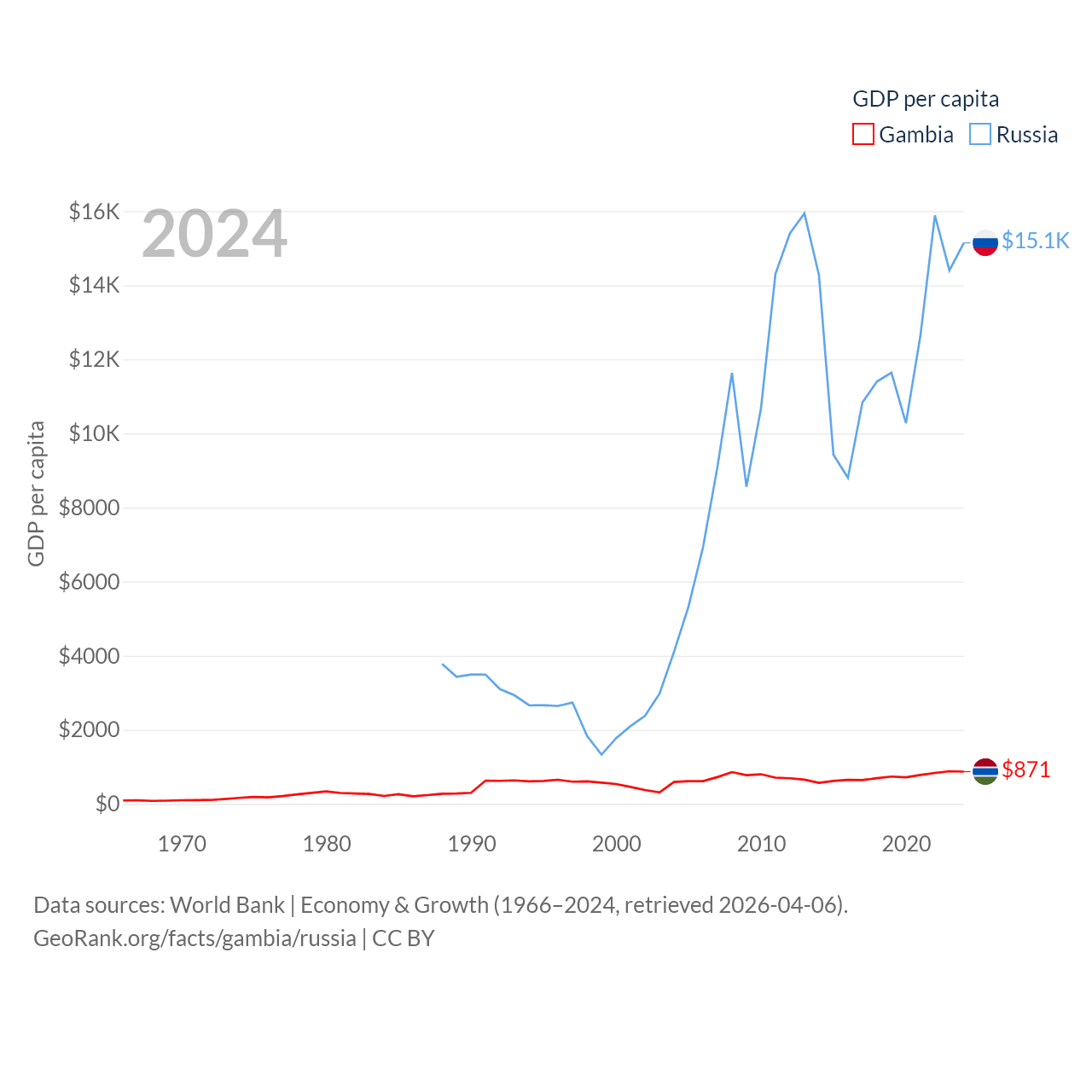 By GDP, The Gambia ranks 174/197 ($2.4B) and Russia ranks 11/197 ($2.17T). By GDP per capita, The Gambia ranks 183/197 ($871), while Russia ranks 68/197 ($15,145).