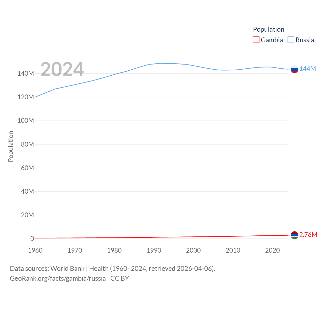 The Gambia has a population of 2.76M (ranked 140/197), compared with 144M in Russia (ranked 9/197). The Gambia's land area is 3,907 sq mi versus 6,323,145 sq mi for Russia (ranked 161st vs. 1st).