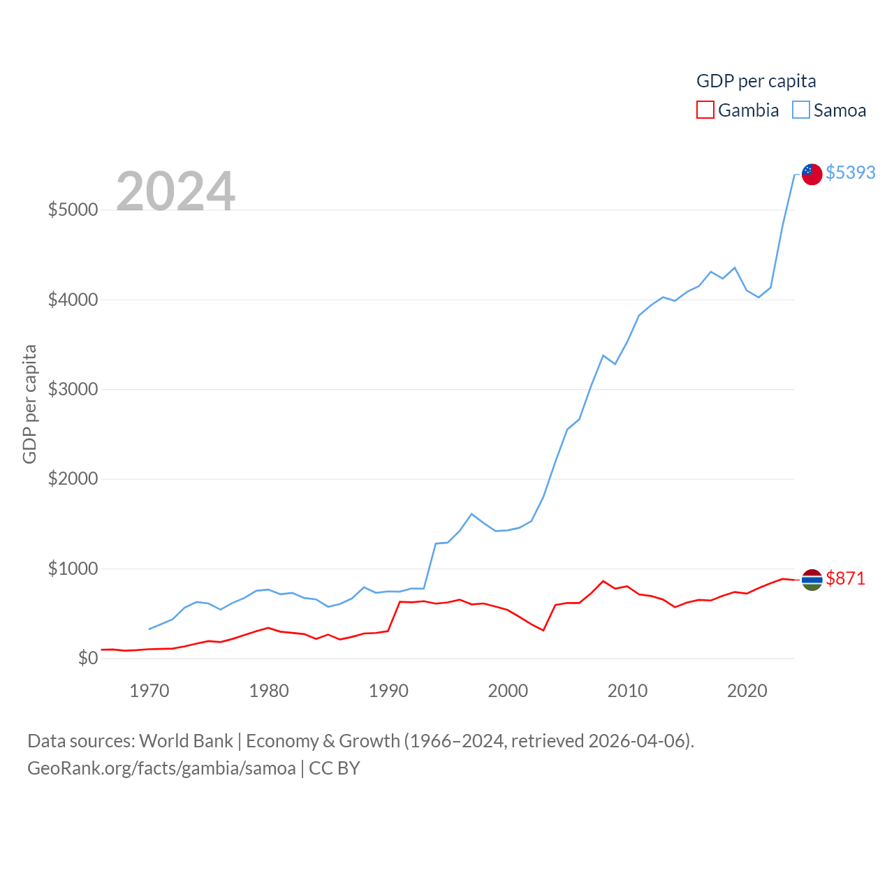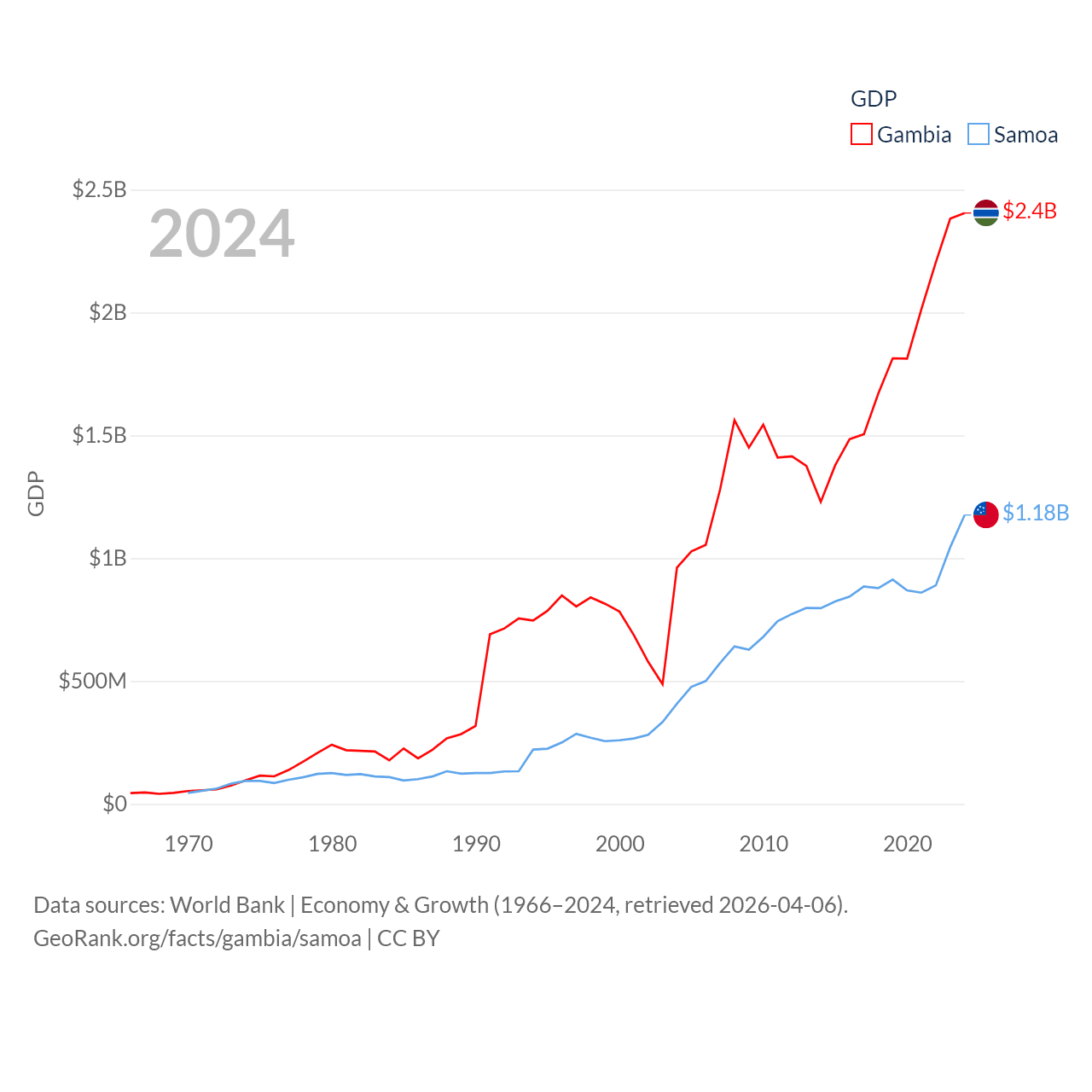 By GDP, The Gambia ranks 174/197 ($2.4B) and Samoa ranks 185/197 ($1.18B). By GDP per capita, The Gambia ranks 183/197 ($871), while Samoa ranks 117/197 ($5,393).