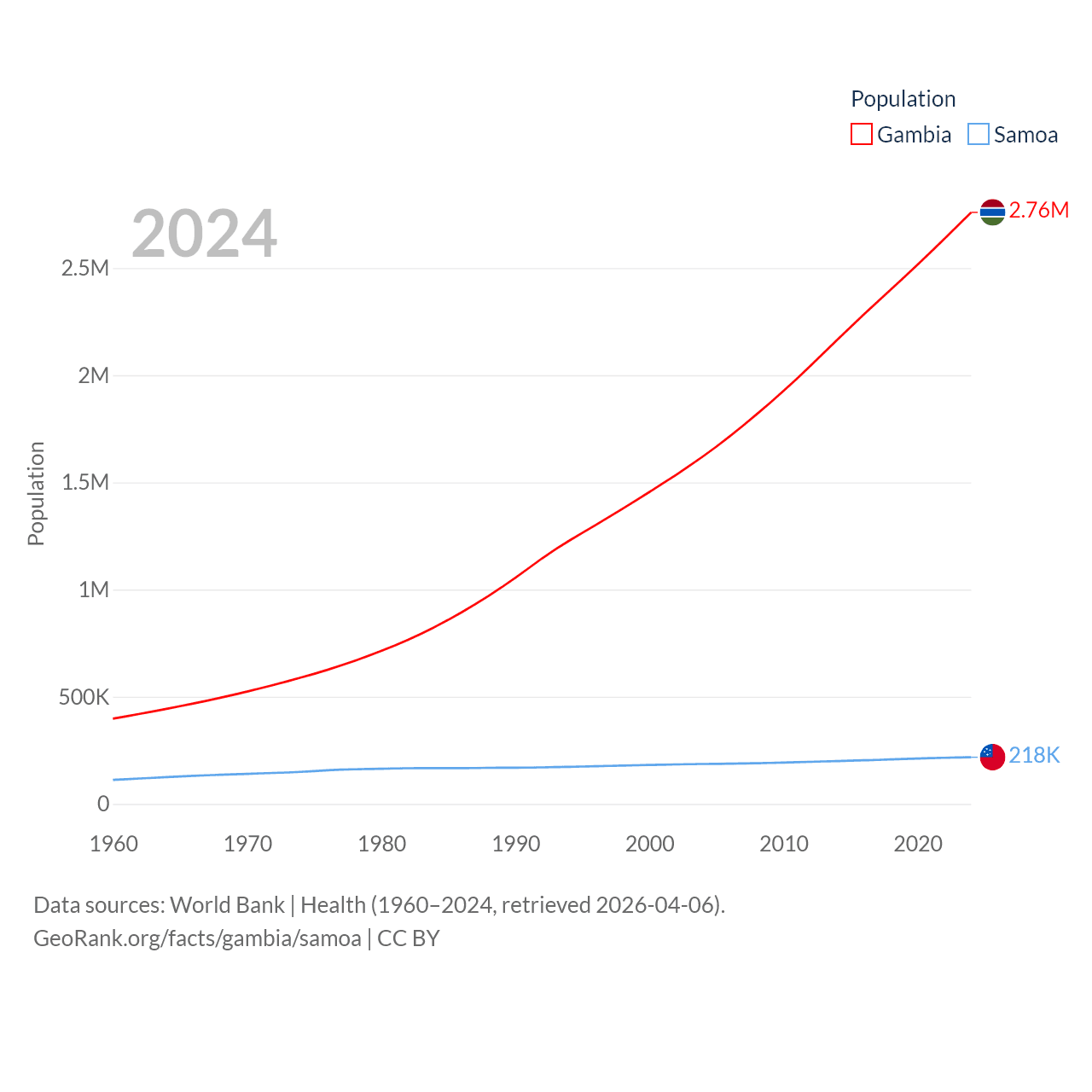 The Gambia has a population of 2.76M (ranked 140/197), compared with 218K in Samoa (ranked 177/197). The Gambia's land area is 3,907 sq mi versus 1,073 sq mi for Samoa (ranked 161st vs. 168th).