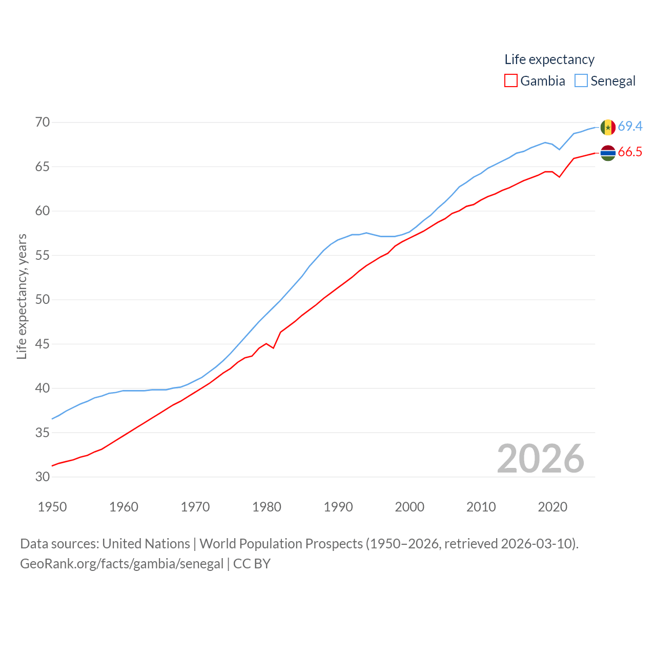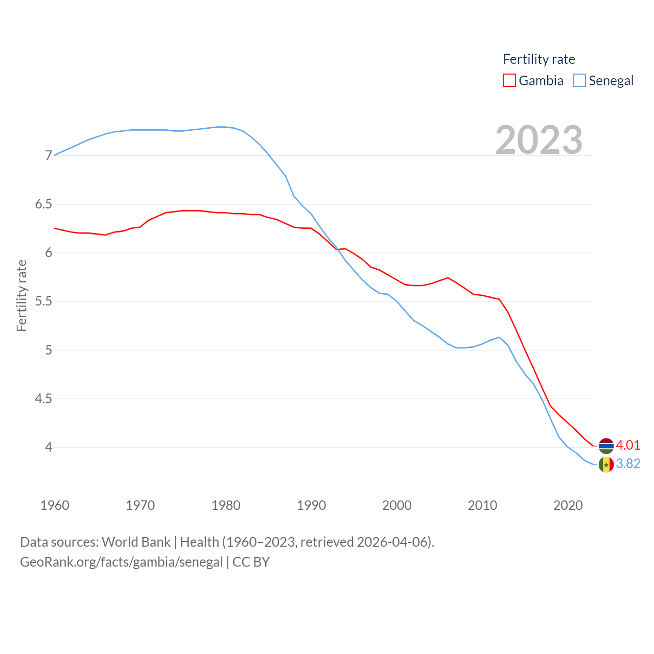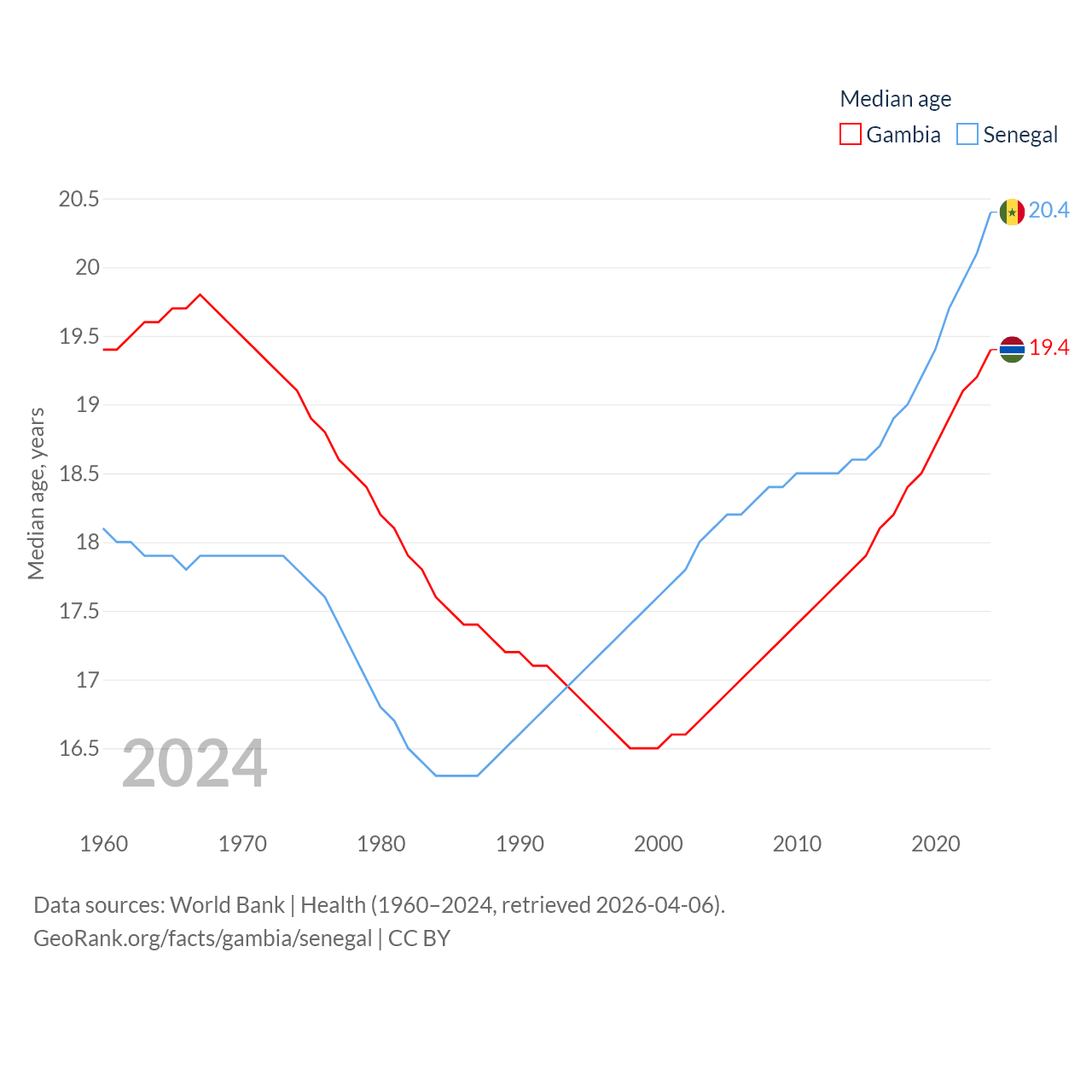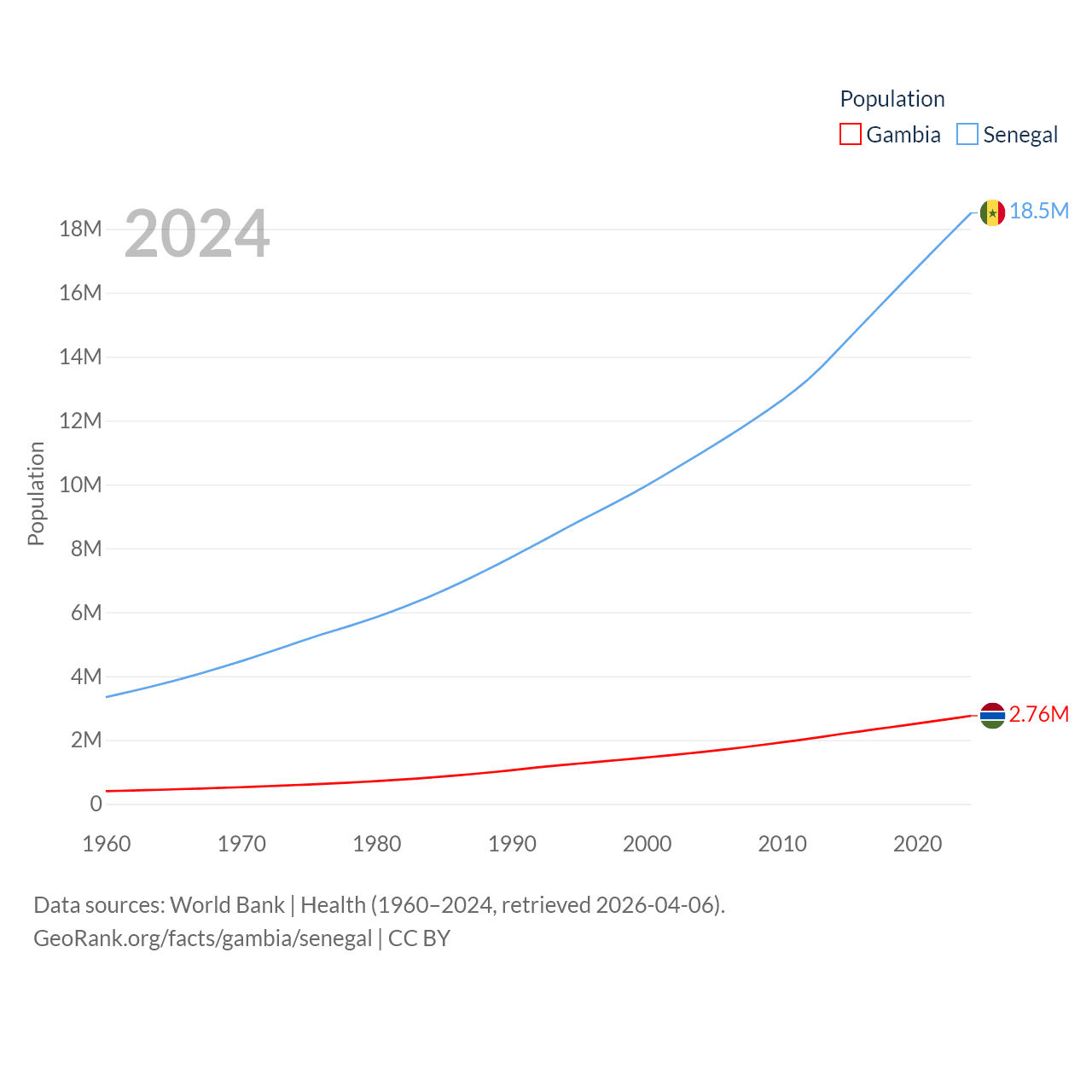The Gambia has a population of 2.76M (ranked 140/197), compared with 18.5M in Senegal (ranked 69/197). The Gambia's land area is 3,907 sq mi versus 74,336 sq mi for Senegal (ranked 161st vs. 85th).