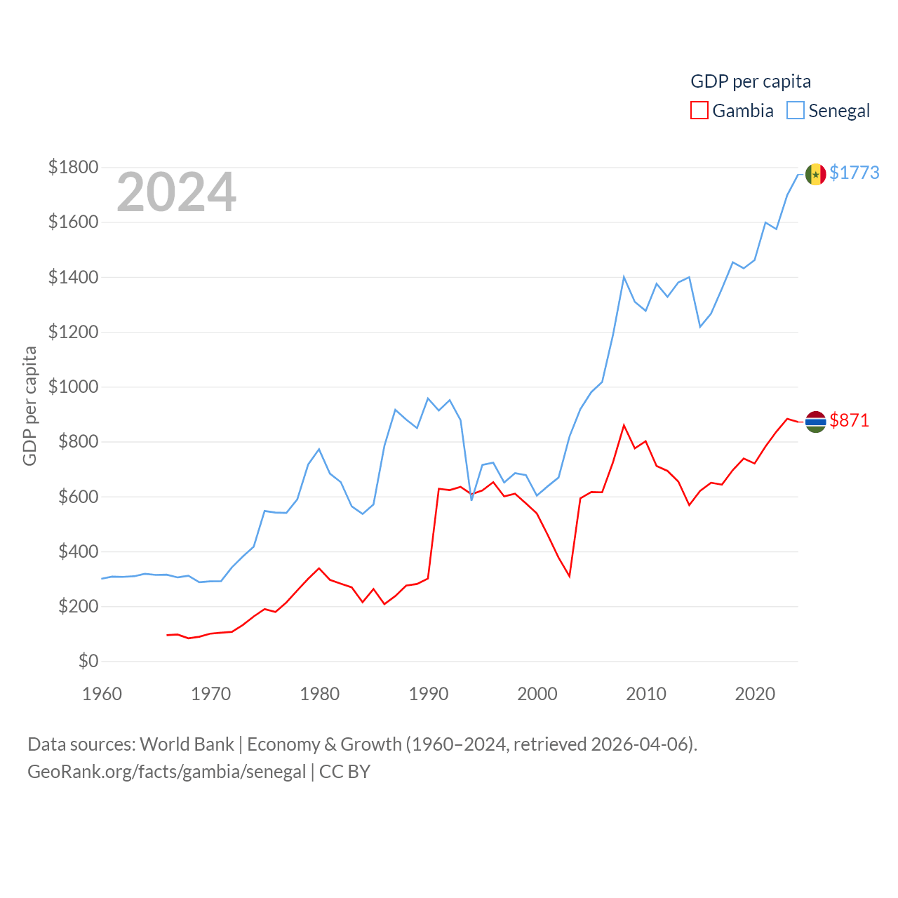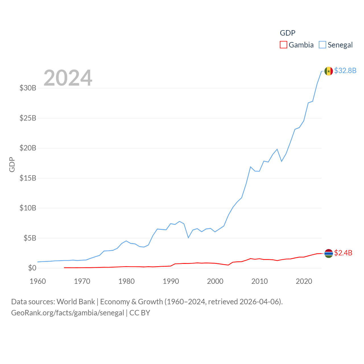 By GDP, The Gambia ranks 174/197 ($2.4B) and Senegal ranks 109/197 ($32.8B). By GDP per capita, The Gambia ranks 183/197 ($871), while Senegal ranks 159/197 ($1,773).