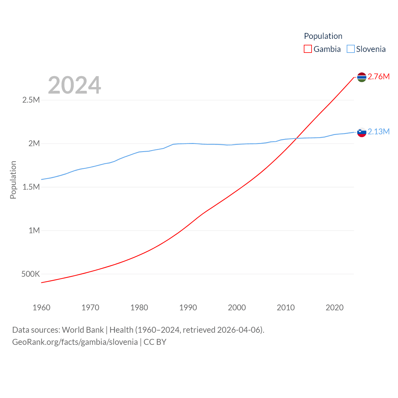 The Gambia has a population of 2.76M (ranked 140/197), compared with 2.13M in Slovenia (ranked 147/197). The Gambia's land area is 3,907 sq mi versus 7,774 sq mi for Slovenia (ranked 161st vs. 151st).