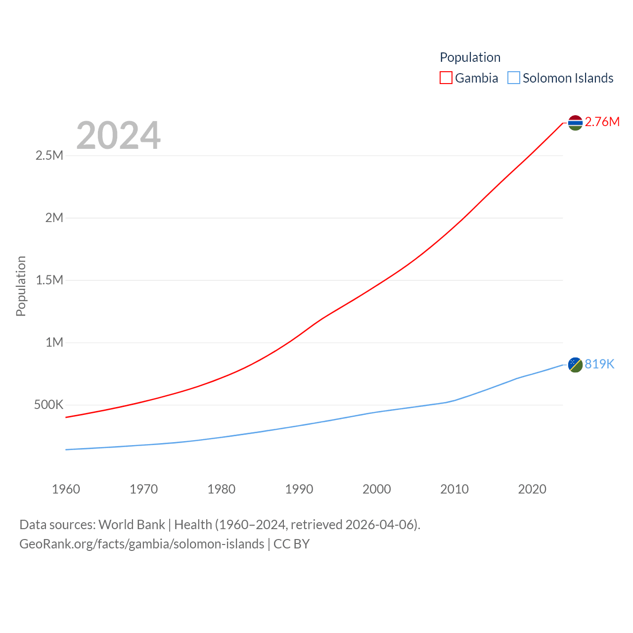 The Gambia has a population of 2.76M (ranked 140/197), compared with 819K in The Solomon Islands (ranked 162/197). The Gambia's land area is 3,907 sq mi versus 10,807 sq mi for The Solomon Islands (ranked 161st vs. 141st).