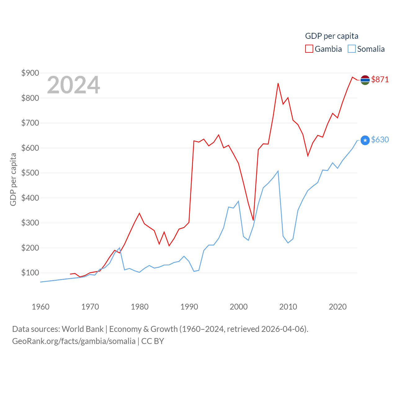 By GDP, The Gambia ranks 174/197 ($2.4B) and Somalia ranks 150/197 ($12B). By GDP per capita, The Gambia ranks 183/197 ($871), while Somalia ranks 192/197 ($630).