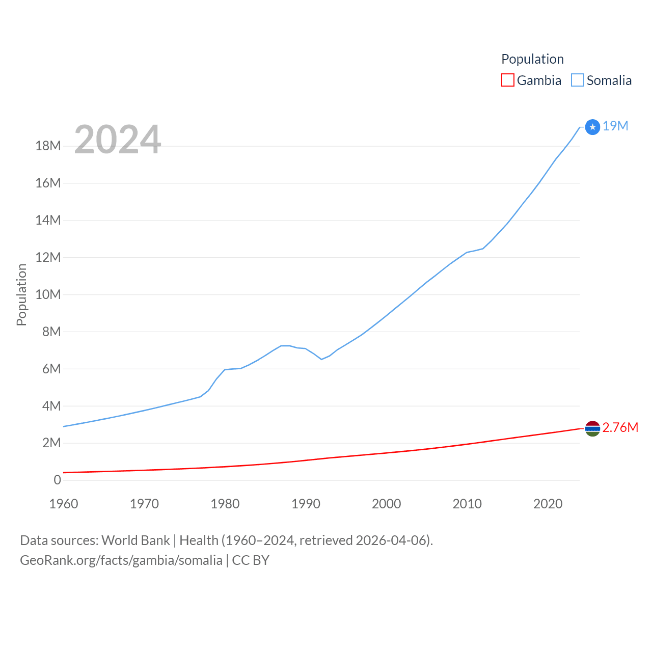 The Gambia has a population of 2.76M (ranked 140/197), compared with 19M in Somalia (ranked 68/197). The Gambia's land area is 3,907 sq mi versus 242,217 sq mi for Somalia (ranked 161st vs. 42nd).
