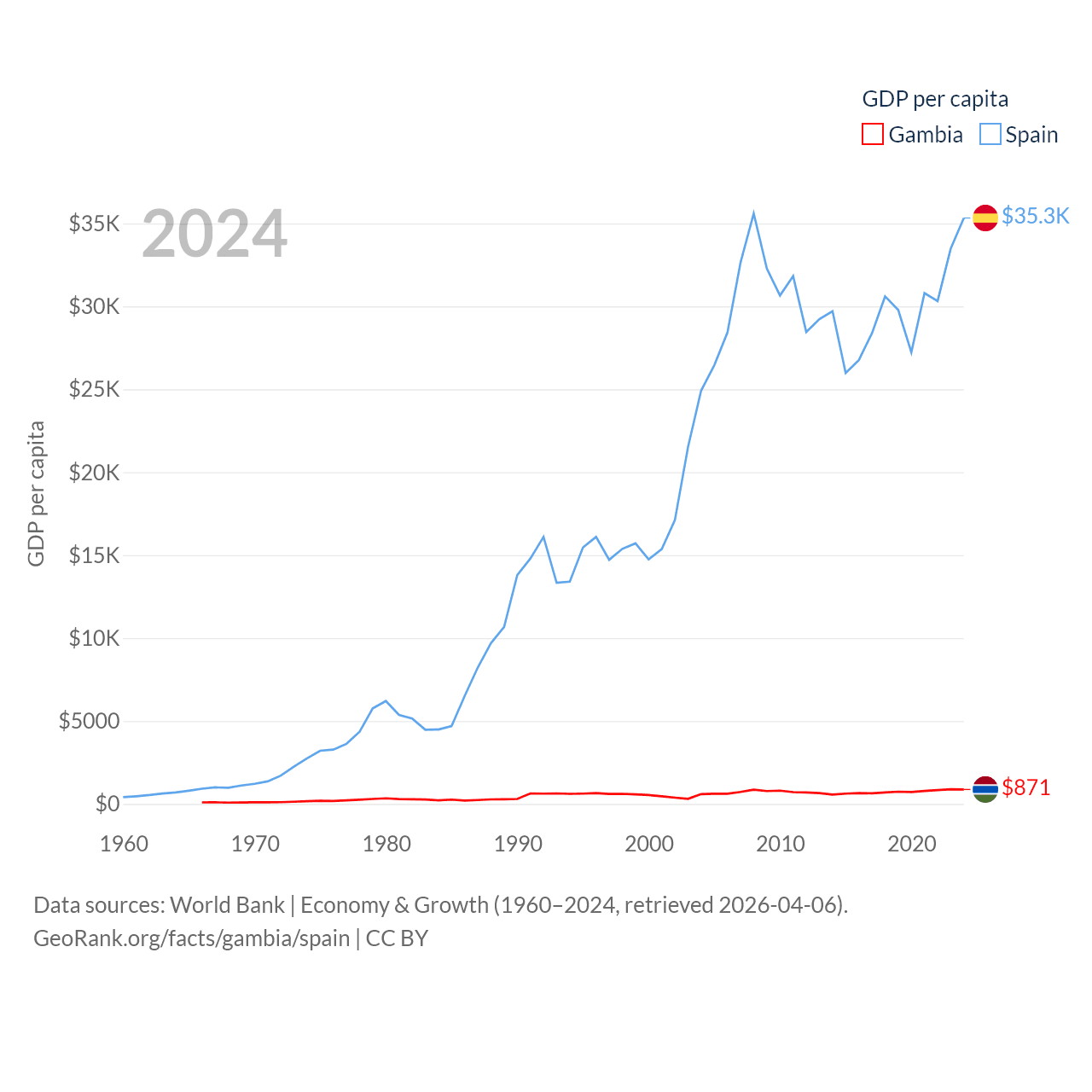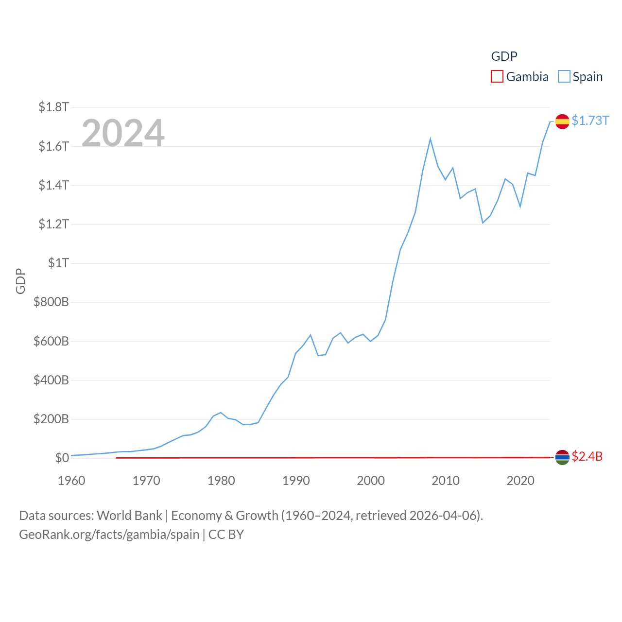By GDP, The Gambia ranks 174/197 ($2.4B) and Spain ranks 15/197 ($1.73T). By GDP per capita, The Gambia ranks 183/197 ($871), while Spain ranks 32/197 ($35,327).