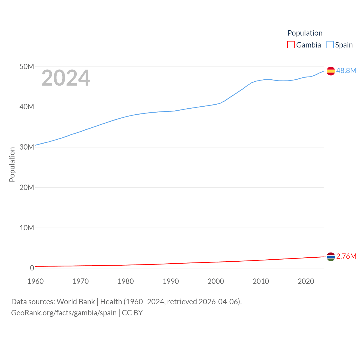 The Gambia has a population of 2.76M (ranked 140/197), compared with 48.8M in Spain (ranked 32/197). The Gambia's land area is 3,907 sq mi versus 192,934 sq mi for Spain (ranked 161st vs. 51st).