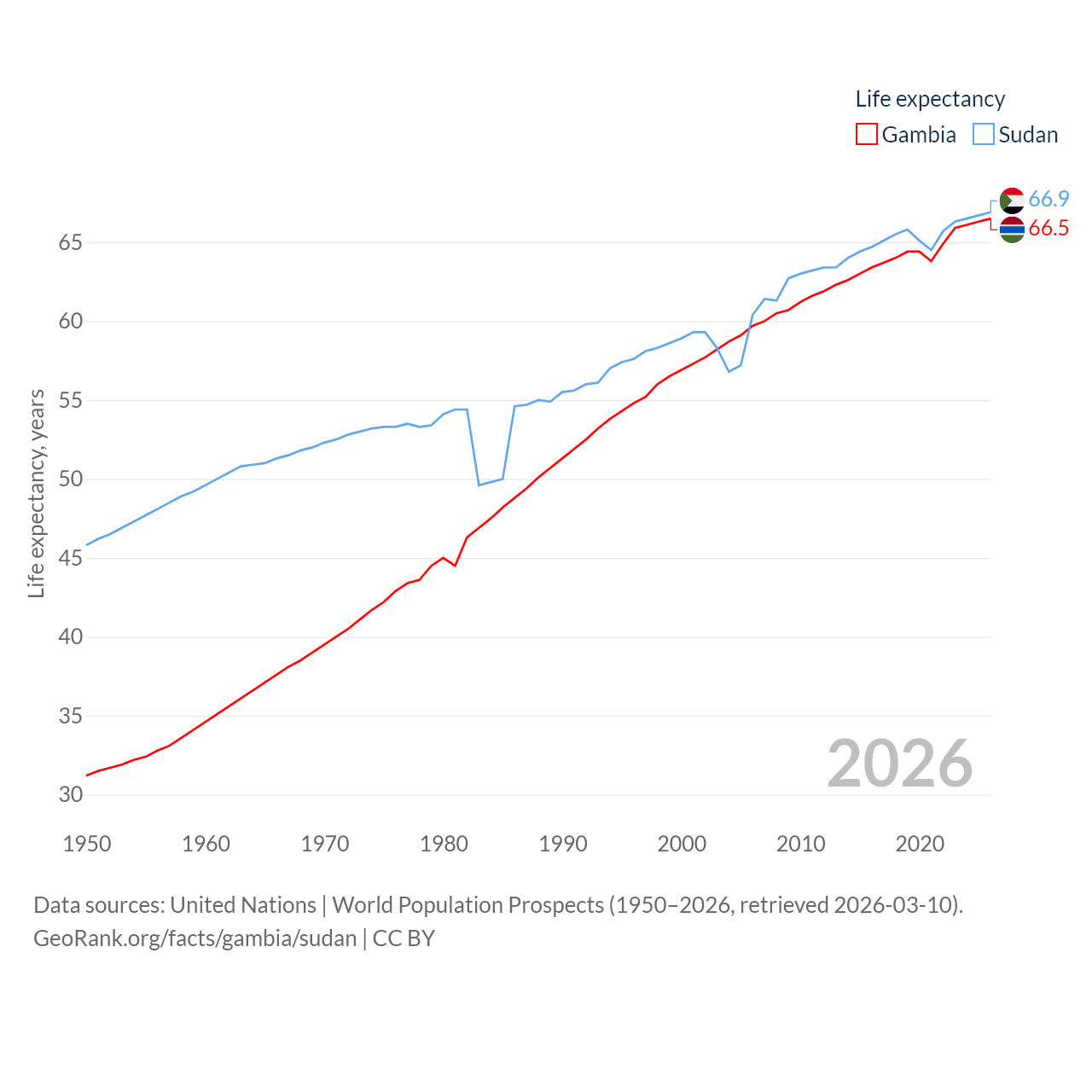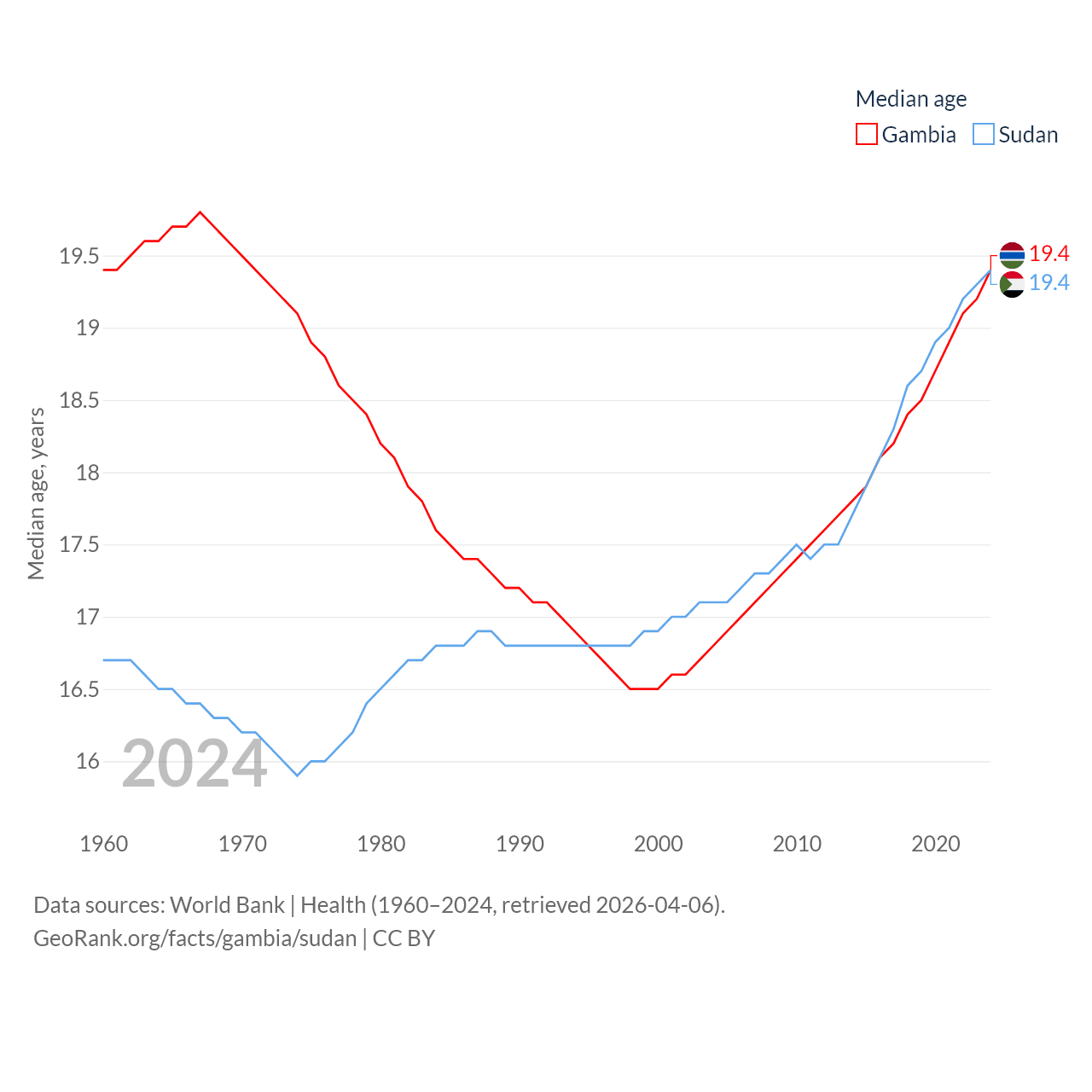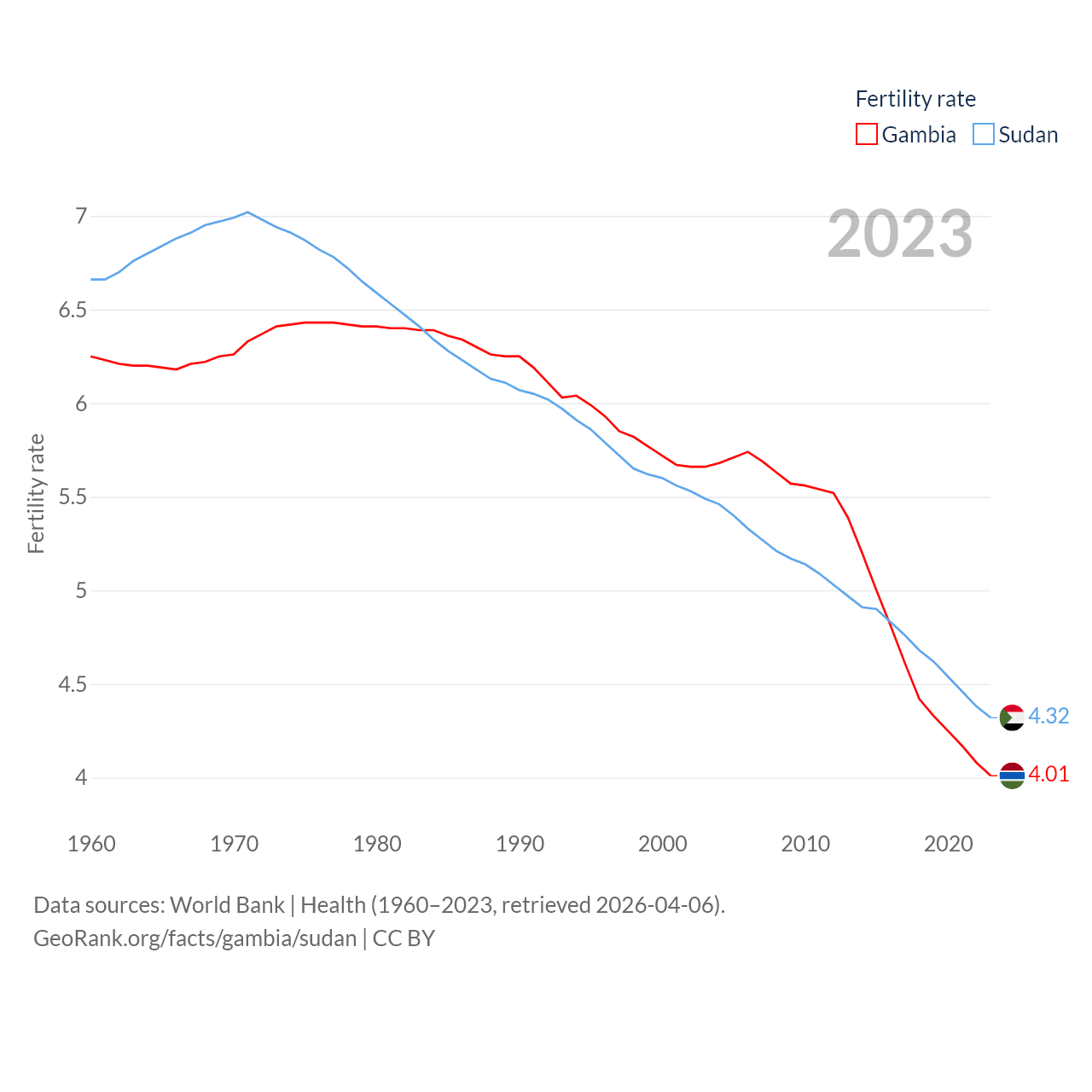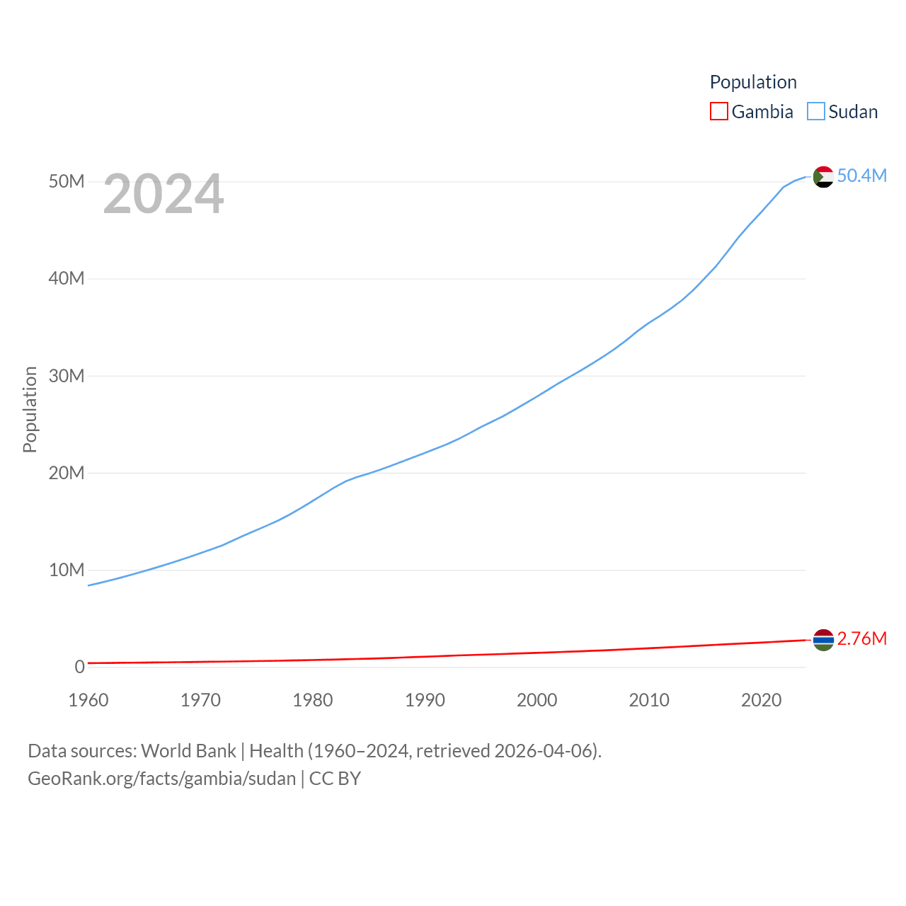 The Gambia has a population of 2.76M (ranked 140/197), compared with 50.4M in Sudan (ranked 30/197). The Gambia's land area is 3,907 sq mi versus 721,239 sq mi for Sudan (ranked 161st vs. 15th).