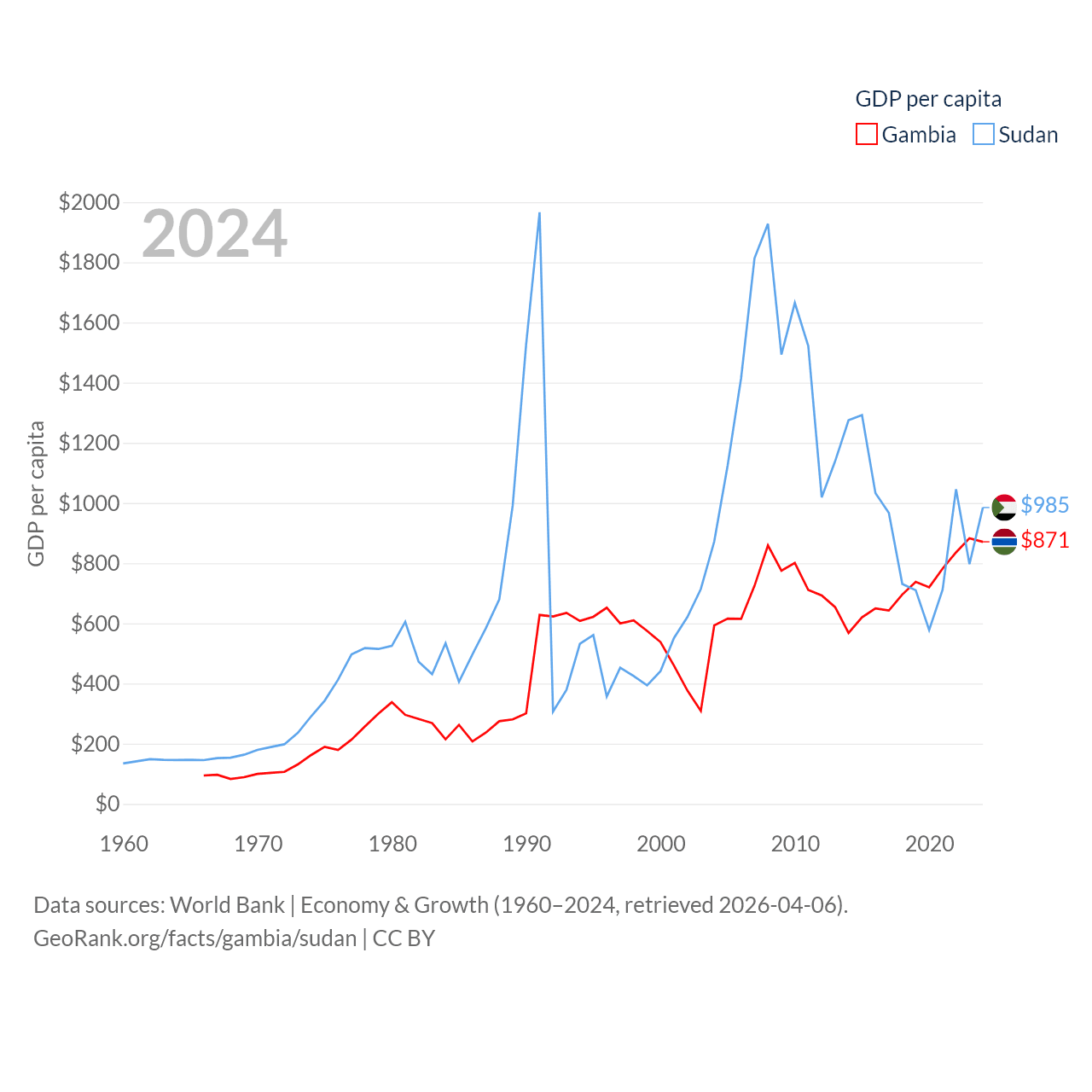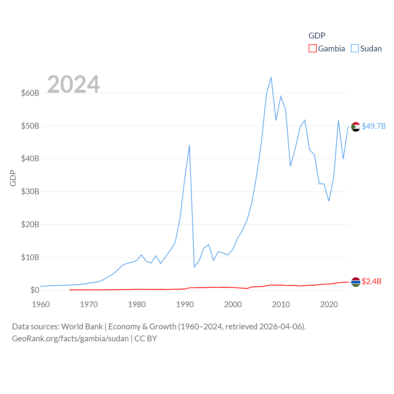 By GDP, The Gambia ranks 174/197 ($2.4B) and Sudan ranks 94/197 ($49.7B). By GDP per capita, The Gambia ranks 183/197 ($871), while Sudan ranks 179/197 ($985).