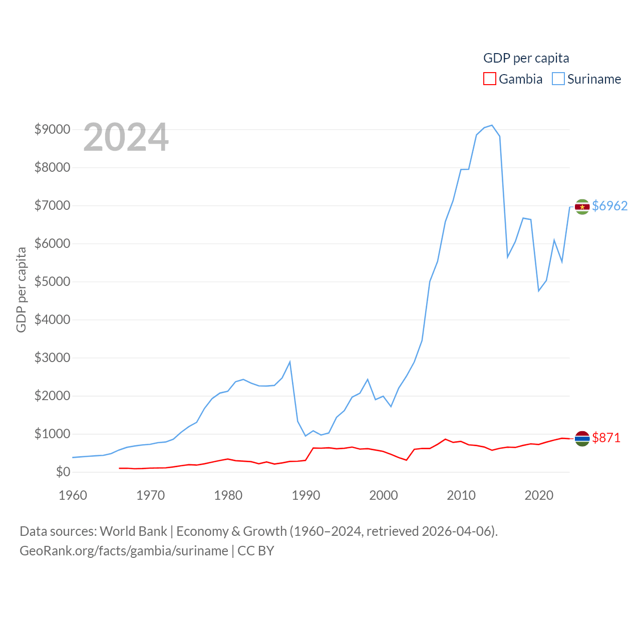 By GDP, The Gambia ranks 174/197 ($2.4B) and Suriname ranks 164/197 ($4.42B). By GDP per capita, The Gambia ranks 183/197 ($871), while Suriname ranks 102/197 ($6,962).
