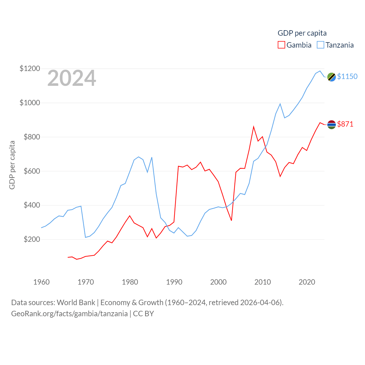 By GDP, The Gambia ranks 174/197 ($2.4B) and Tanzania ranks 82/197 ($78.8B). By GDP per capita, The Gambia ranks 183/197 ($871), while Tanzania ranks 170/197 ($1,150).