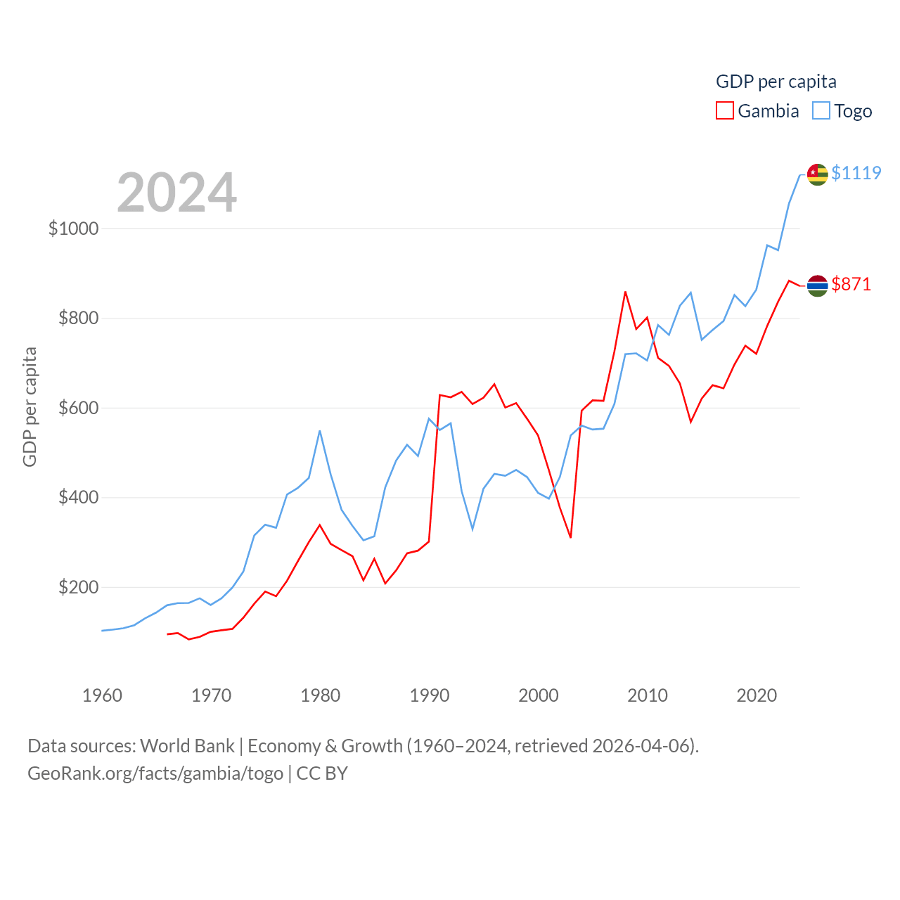 By GDP, The Gambia ranks 174/197 ($2.4B) and Togo ranks 154/197 ($10.7B). By GDP per capita, The Gambia ranks 183/197 ($871), while Togo ranks 172/197 ($1,119).