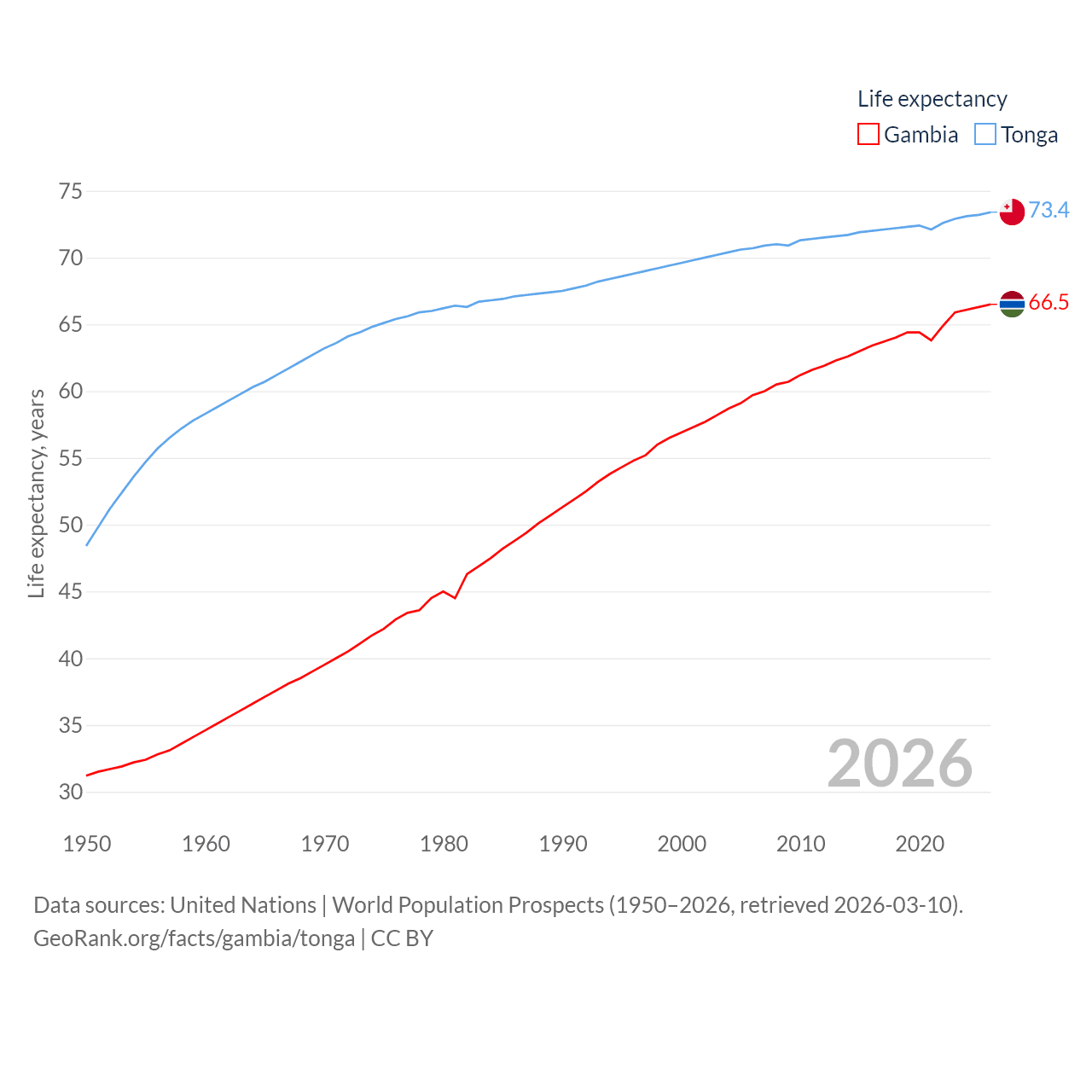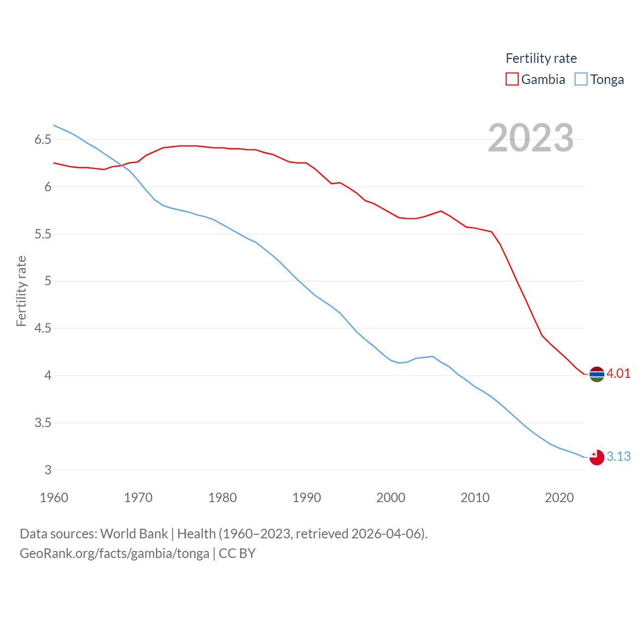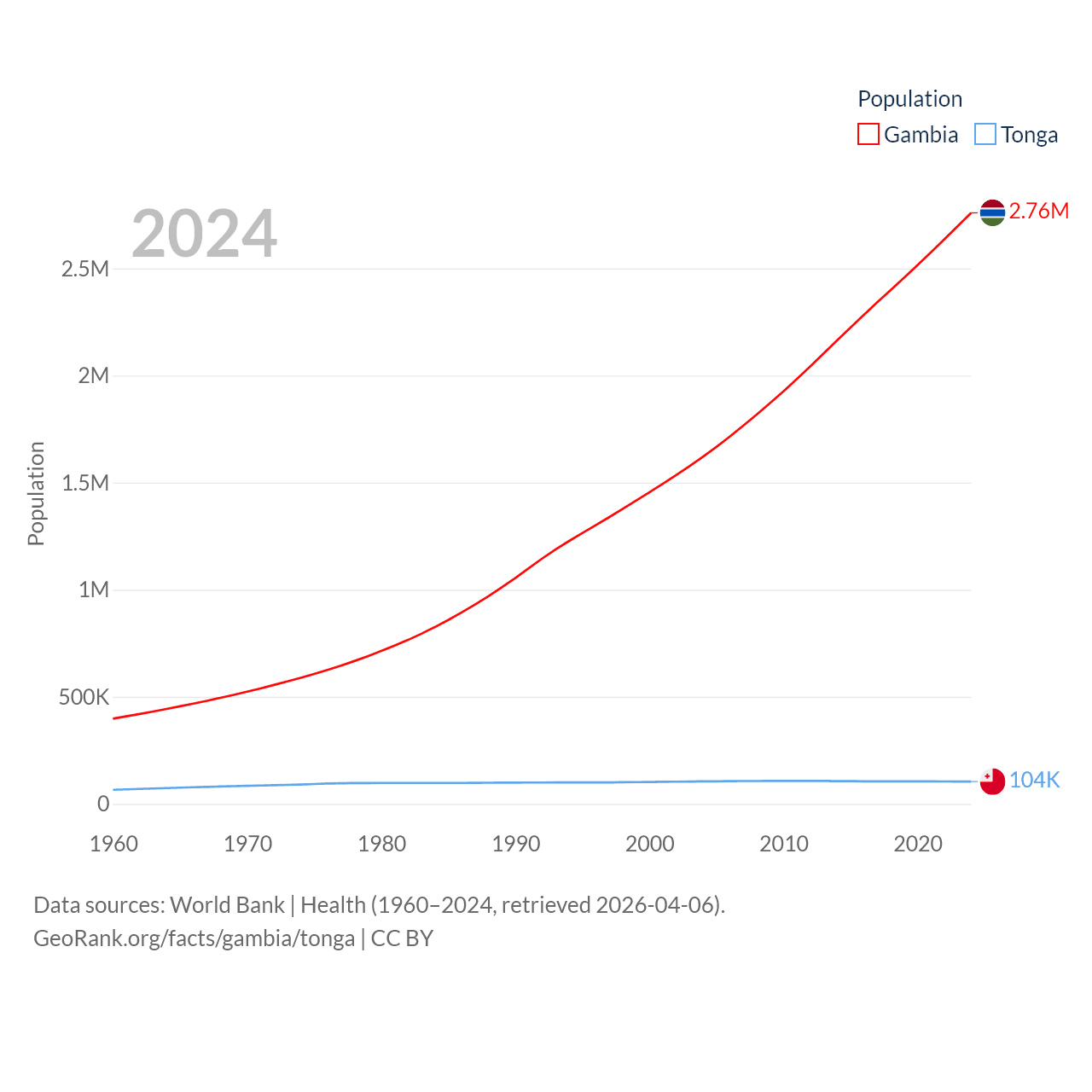 The Gambia has a population of 2.76M (ranked 140/197), compared with 104K in Tonga (ranked 183/197). The Gambia's land area is 3,907 sq mi versus 278 sq mi for Tonga (ranked 161st vs. 176th).