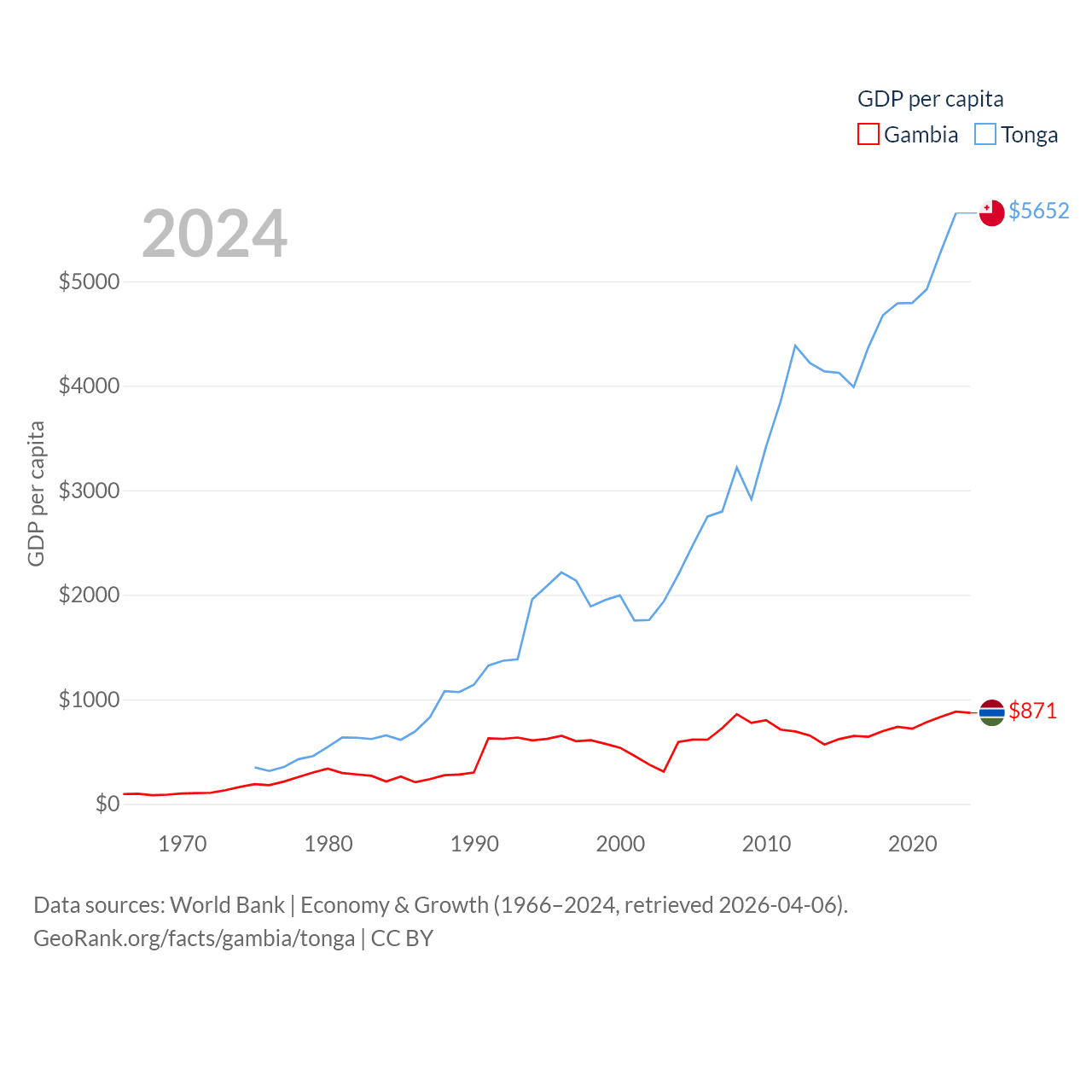 By GDP, The Gambia ranks 174/197 ($2.4B) and Tonga ranks 191/197 ($591M). By GDP per capita, The Gambia ranks 183/197 ($871), while Tonga ranks 115/197 ($5,652).