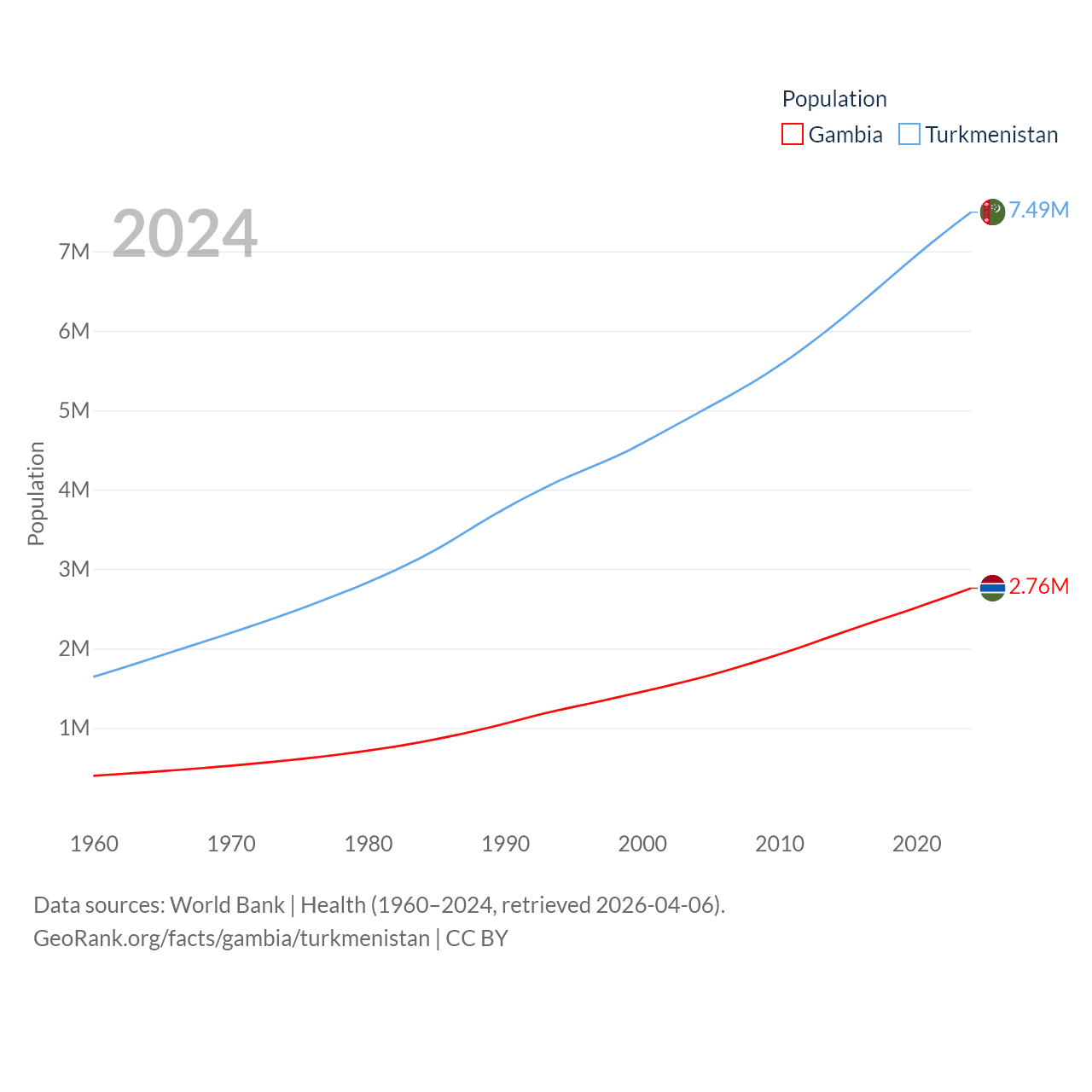 The Gambia has a population of 2.76M (ranked 140/197), compared with 7.49M in Turkmenistan (ranked 104/197). The Gambia's land area is 3,907 sq mi versus 181,441 sq mi for Turkmenistan (ranked 161st vs. 53rd).