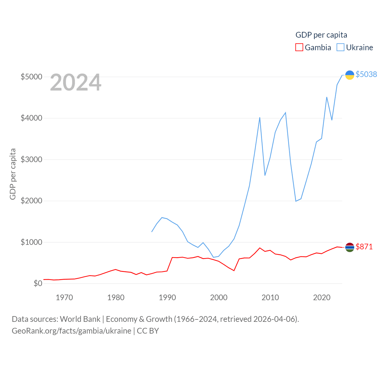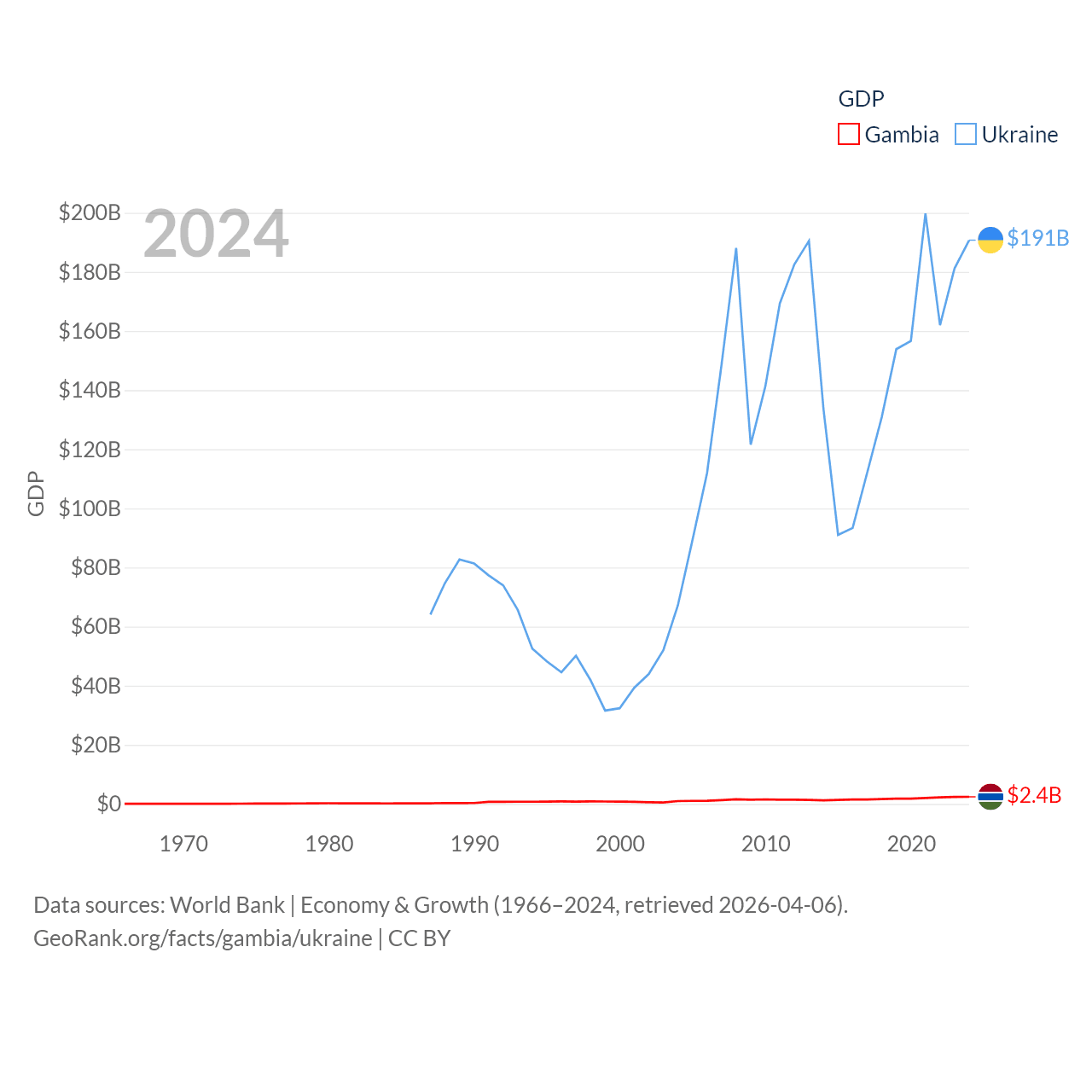 By GDP, The Gambia ranks 174/197 ($2.4B) and Ukraine ranks 57/197 ($191B). By GDP per capita, The Gambia ranks 183/197 ($871), while Ukraine ranks 120/197 ($5,038).