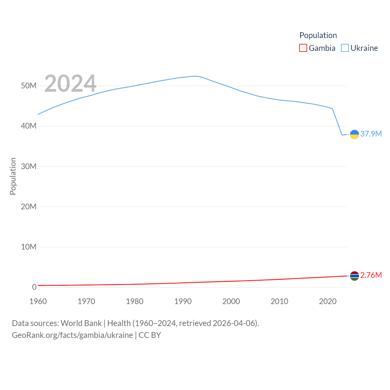 The Gambia has a population of 2.76M (ranked 140/197), compared with 37.9M in Ukraine (ranked 41/197). The Gambia's land area is 3,907 sq mi versus 223,708 sq mi for Ukraine (ranked 161st vs. 46th).