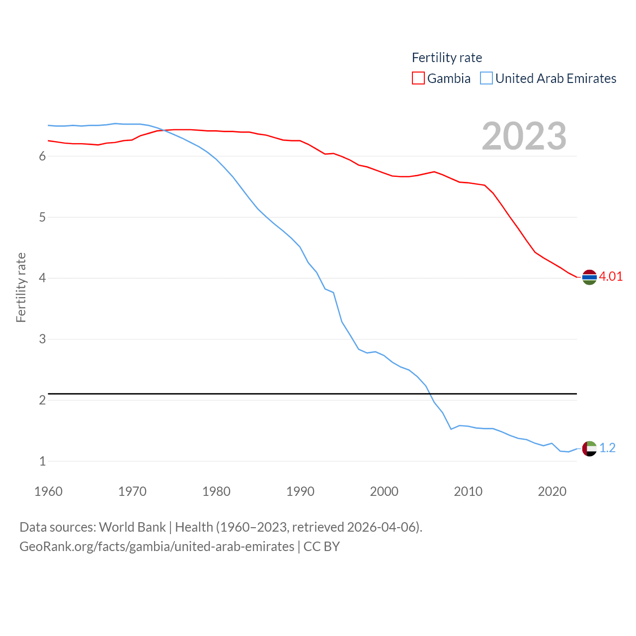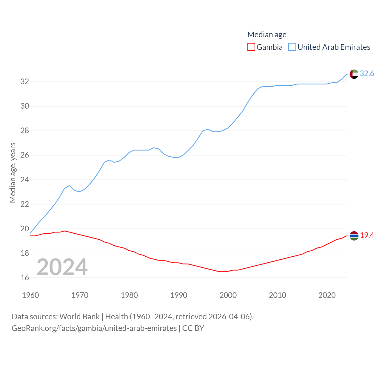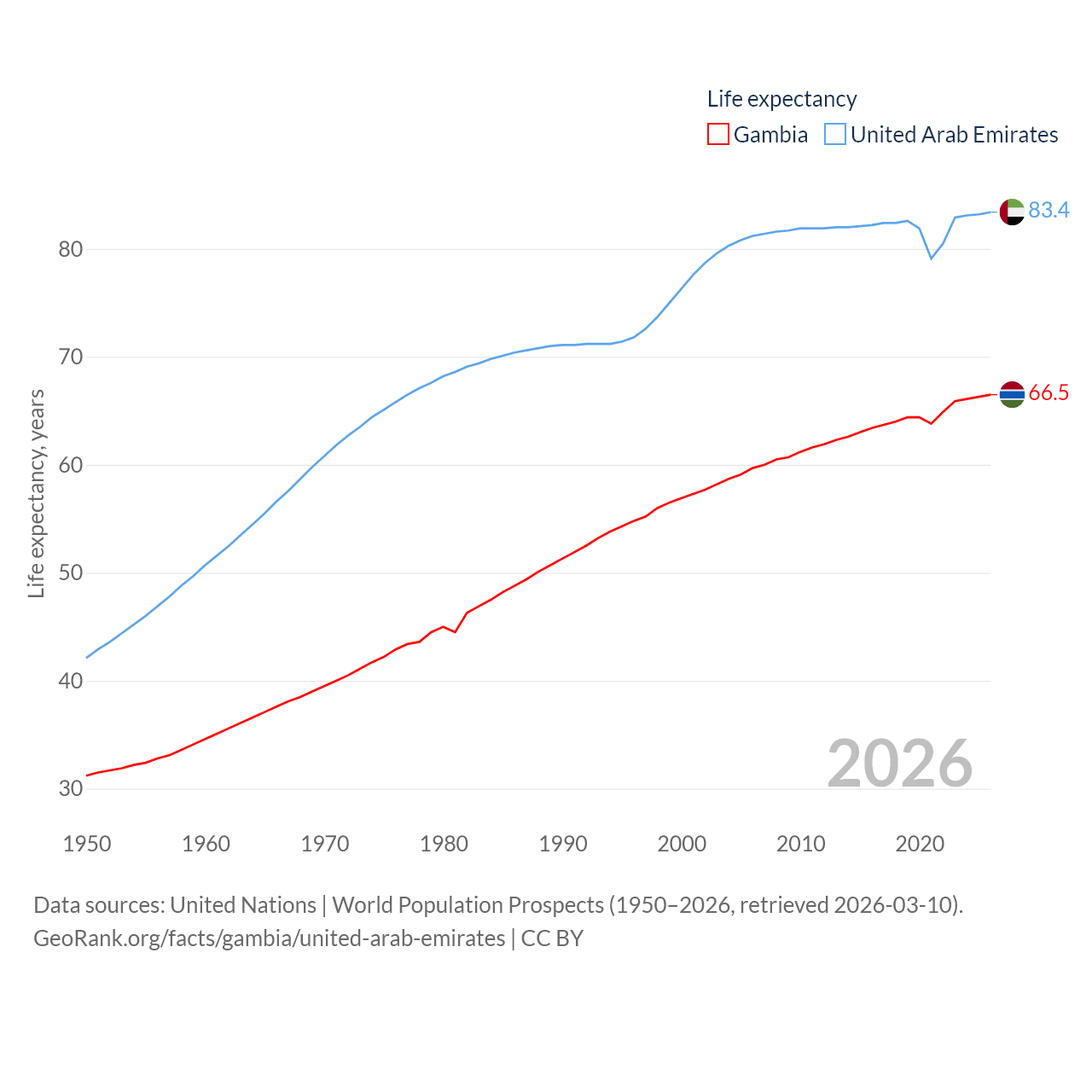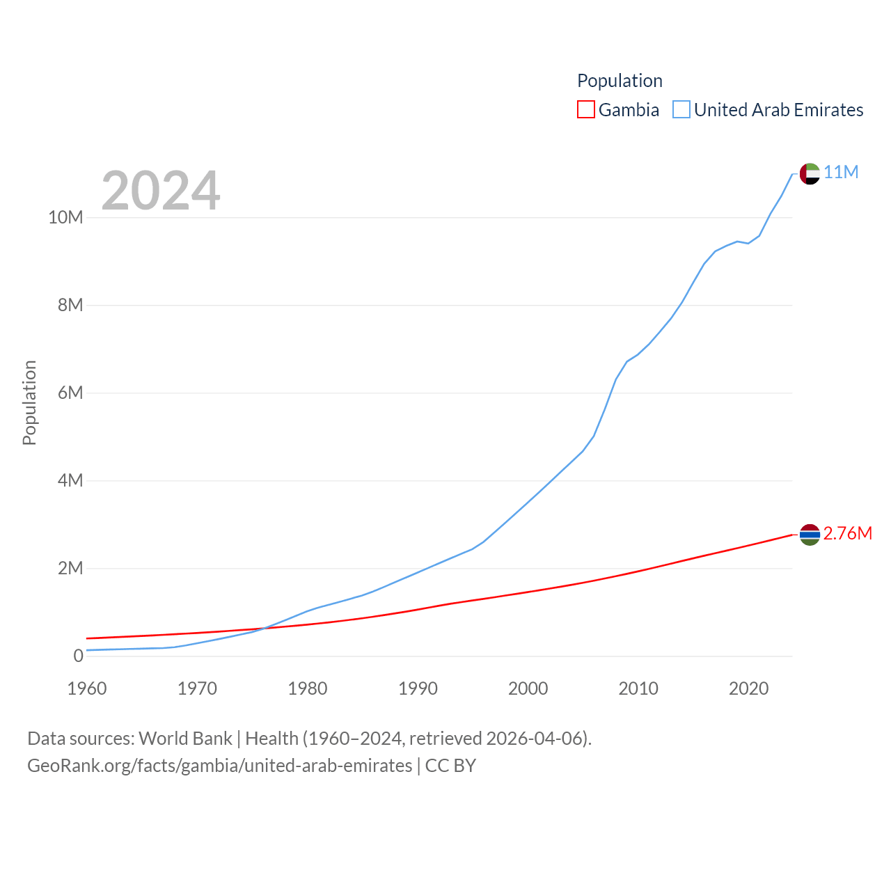 The Gambia has a population of 2.76M (ranked 140/197), compared with 11M in The United Arab Emirates (ranked 86/197). The Gambia's land area is 3,907 sq mi versus 27,421 sq mi for The United Arab Emirates (ranked 161st vs. 117th).
