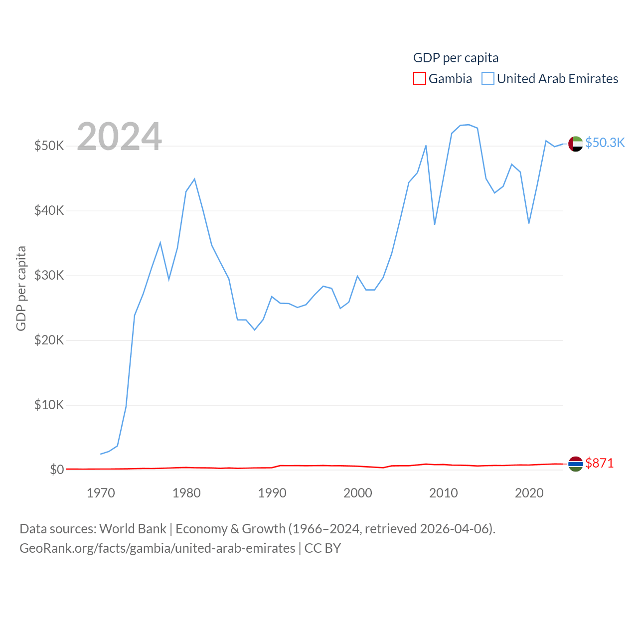 By GDP, The Gambia ranks 174/197 ($2.4B) and The United Arab Emirates ranks 27/197 ($552B). By GDP per capita, The Gambia ranks 183/197 ($871), while The United Arab Emirates ranks 24/197 ($50,274).