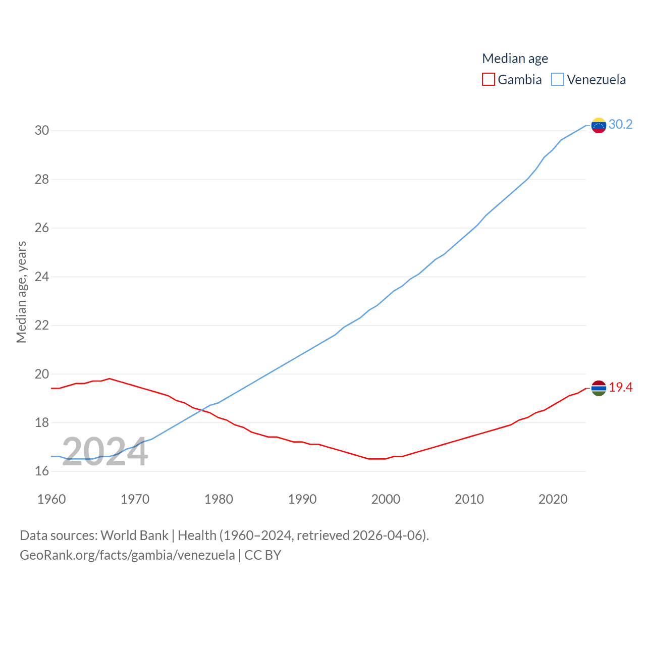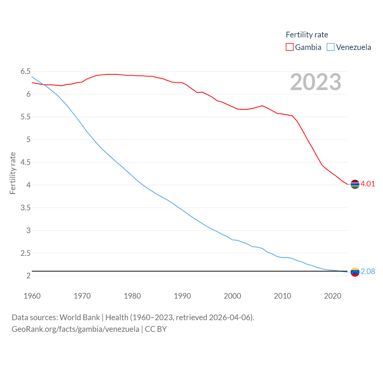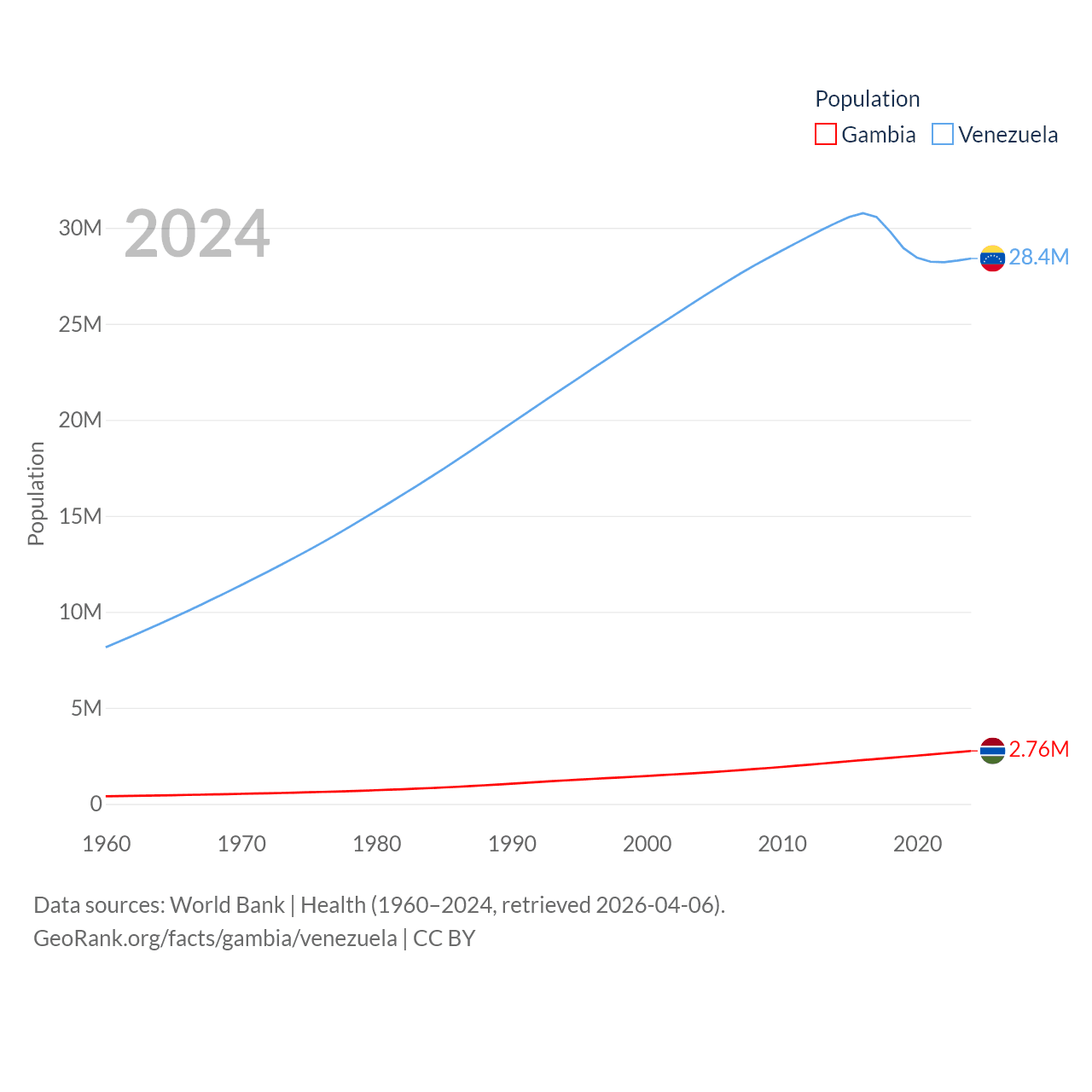 The Gambia has a population of 2.76M (ranked 140/197), compared with 28.4M in Venezuela (ranked 53/197). The Gambia's land area is 3,907 sq mi versus 340,561 sq mi for Venezuela (ranked 161st vs. 32nd).