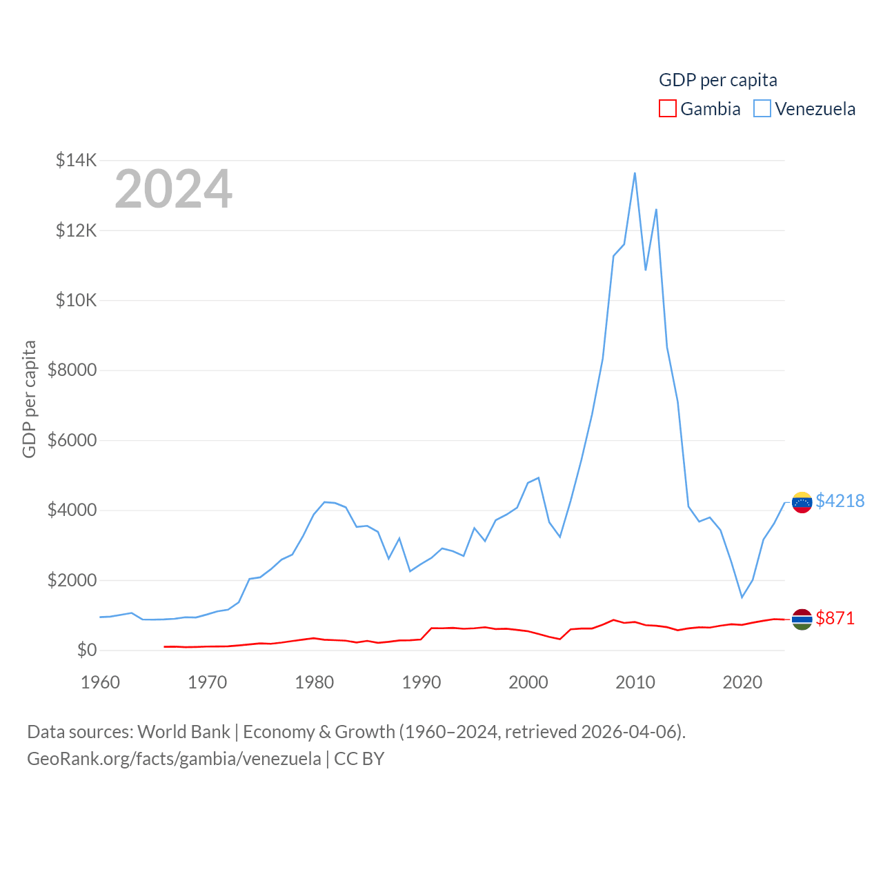 By GDP, The Gambia ranks 174/197 ($2.4B) and Venezuela ranks 65/197 ($120B). By GDP per capita, The Gambia ranks 183/197 ($871), while Venezuela ranks 128/197 ($4,218).