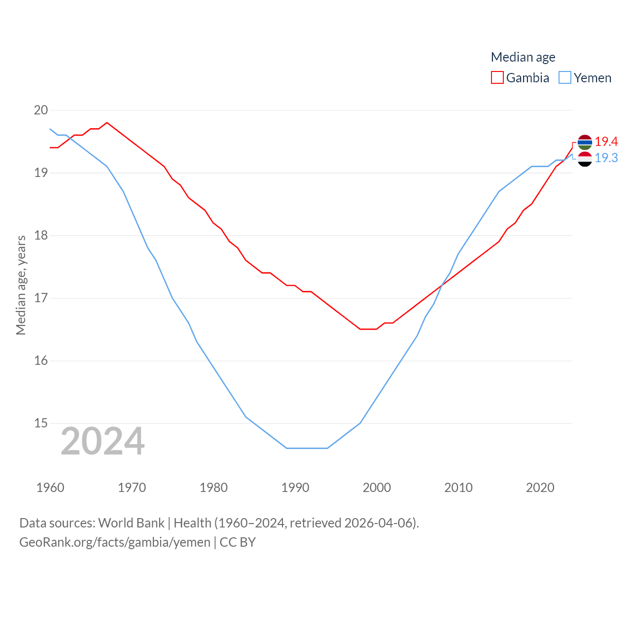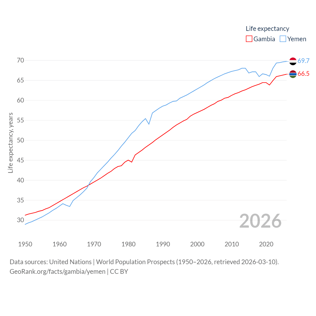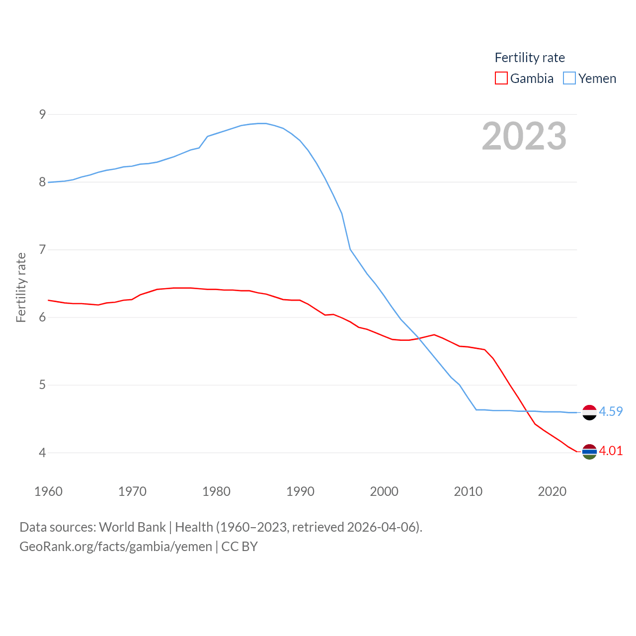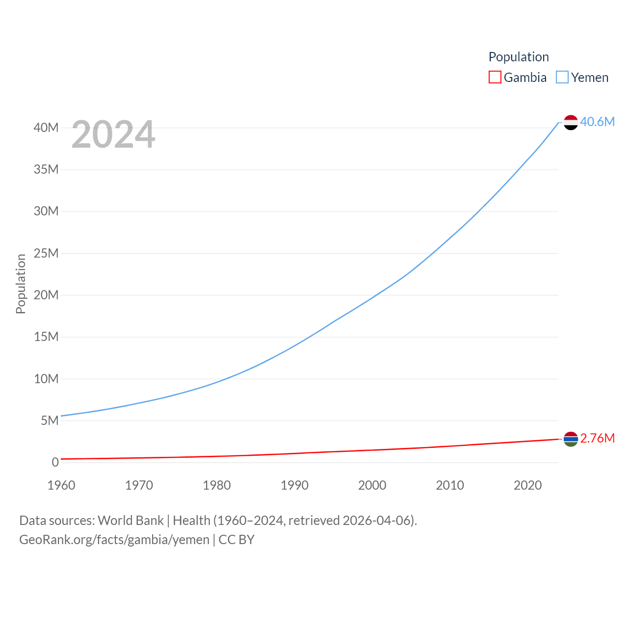 The Gambia has a population of 2.76M (ranked 140/197), compared with 40.6M in Yemen (ranked 38/197). The Gambia's land area is 3,907 sq mi versus 203,850 sq mi for Yemen (ranked 161st vs. 49th).