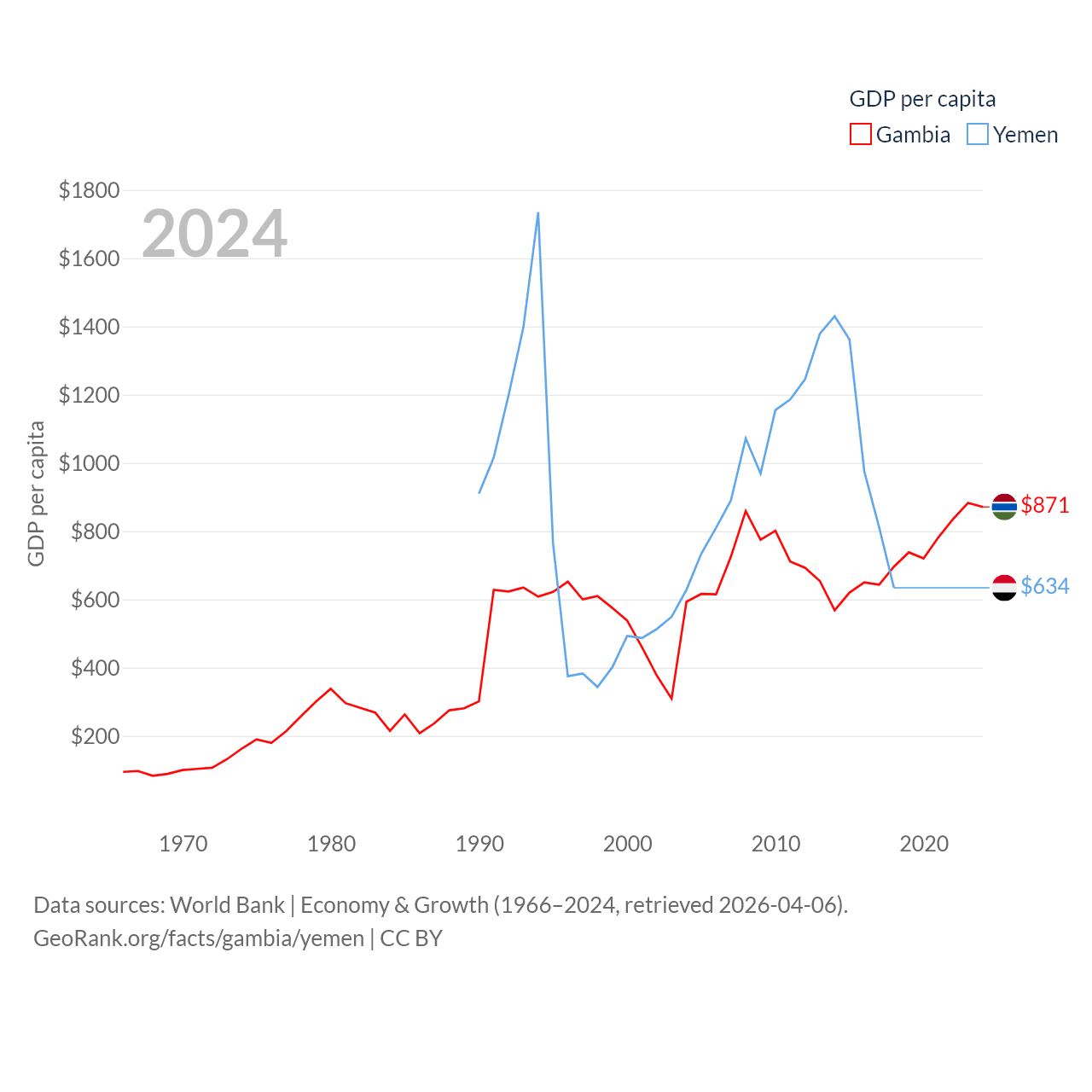 By GDP, The Gambia ranks 174/197 ($2.4B) and Yemen ranks 125/197 ($21.6B). By GDP per capita, The Gambia ranks 183/197 ($871), while Yemen ranks 191/197 ($634).